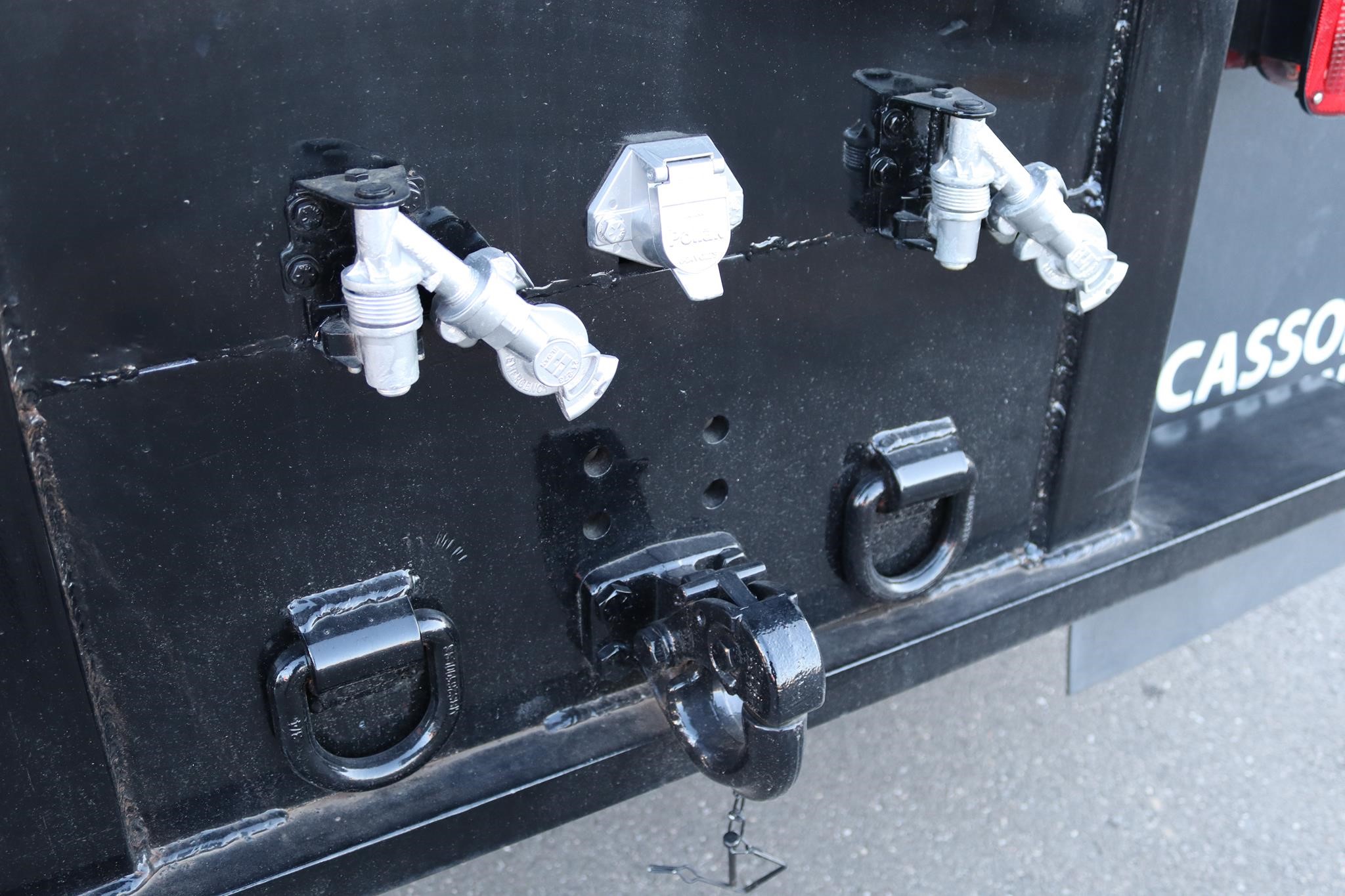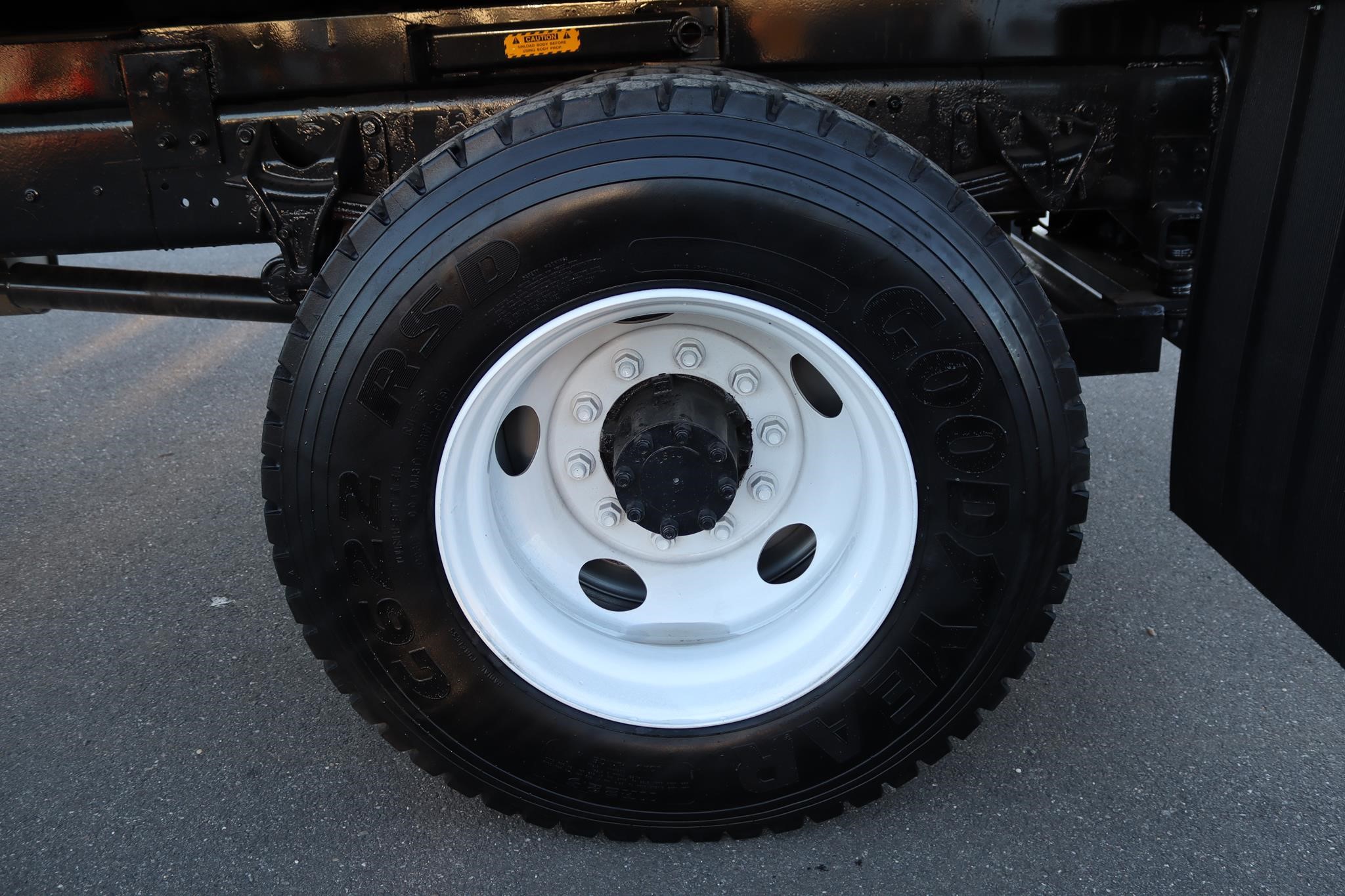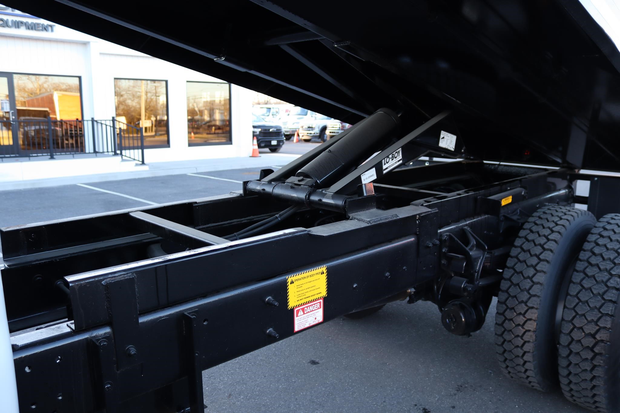 This commercial truck comes equipped with a Brand-New Crysteel 12′ Mason body (Serial # – 41216389) that has 24″ sides, 26″ cab protector, fitted with a Lo-Boy E-15 hoist, and is equipped with a 20-ton pintle hitch, air to the rear, and 7-way round plug.