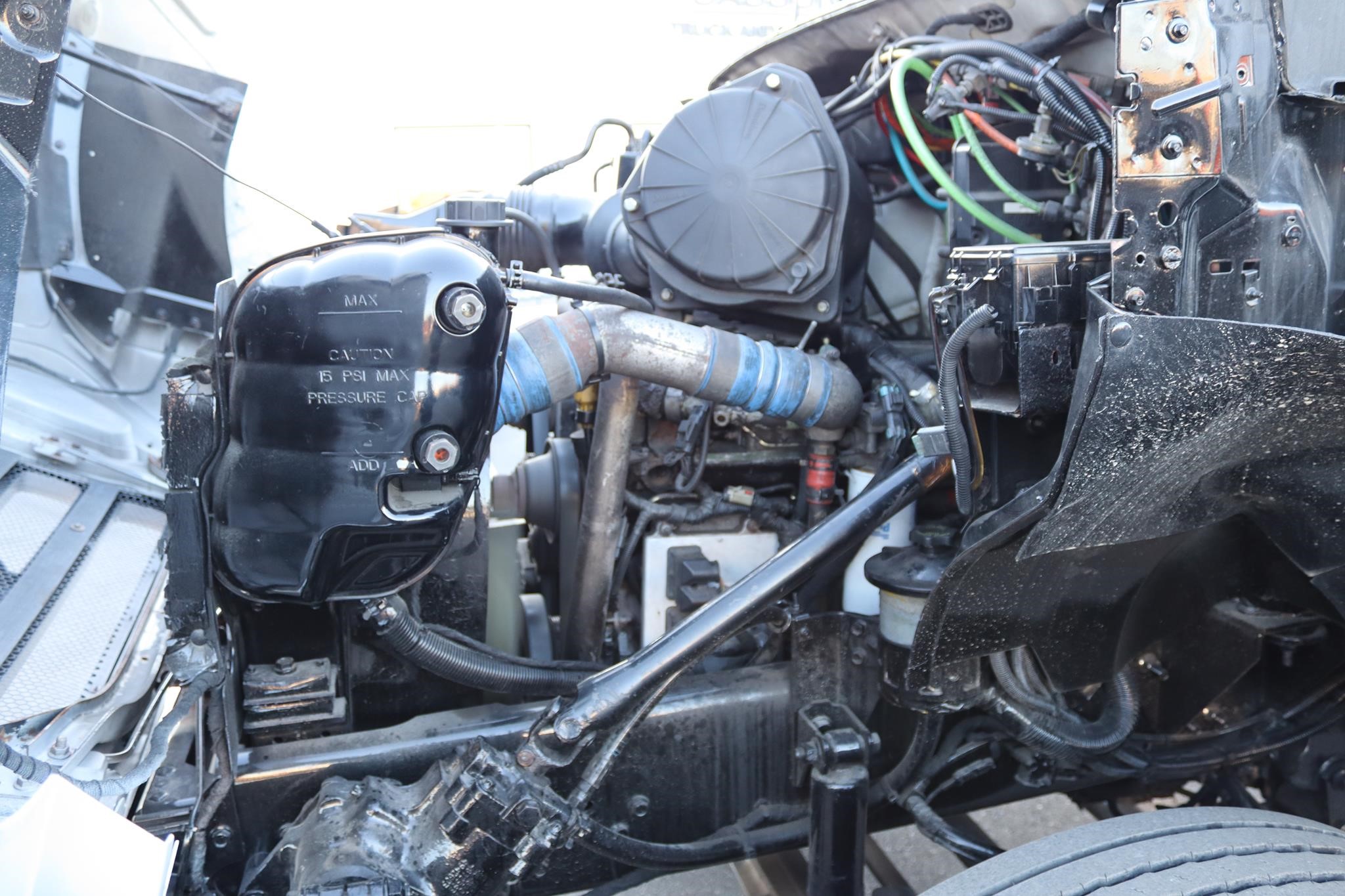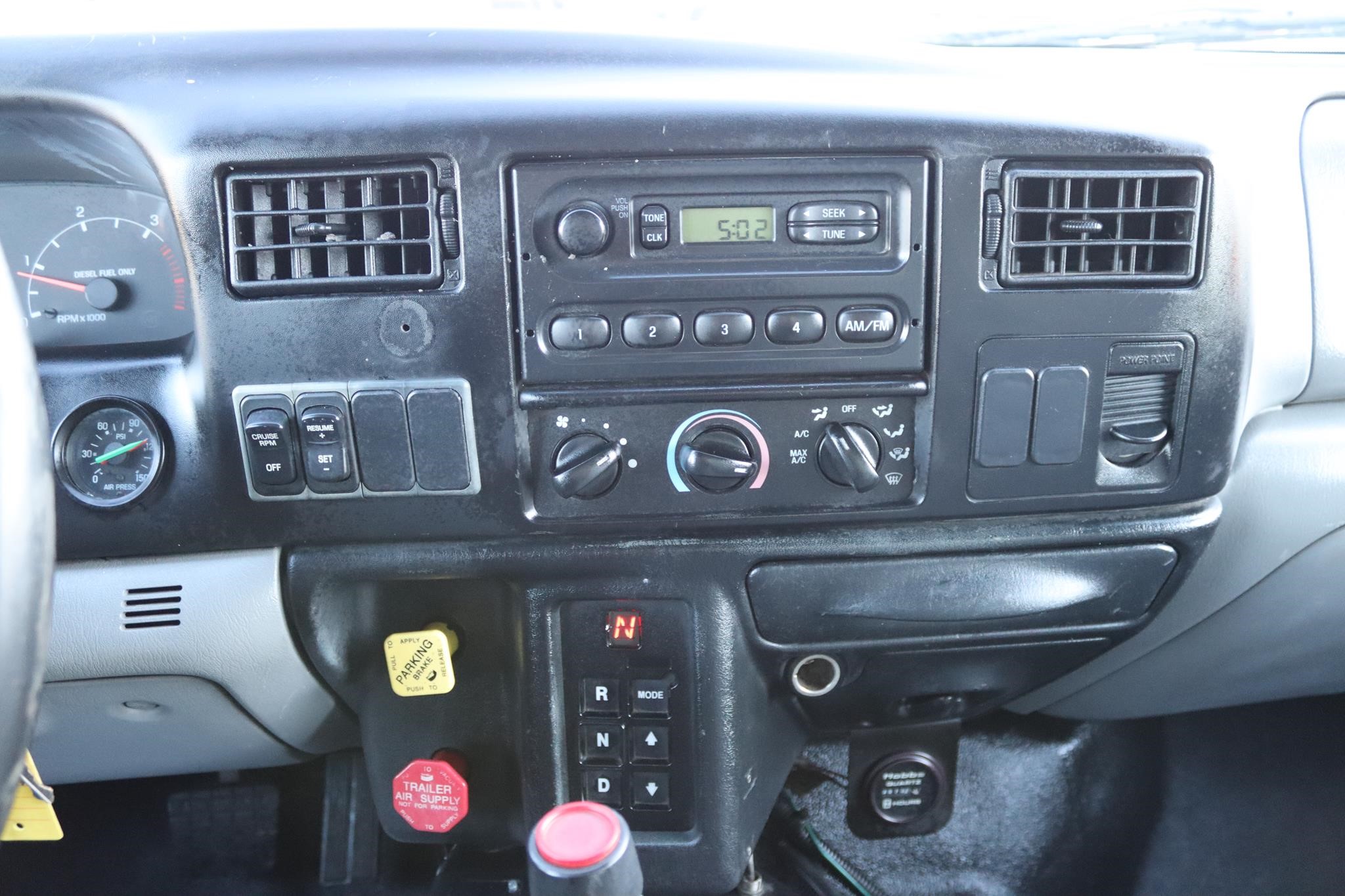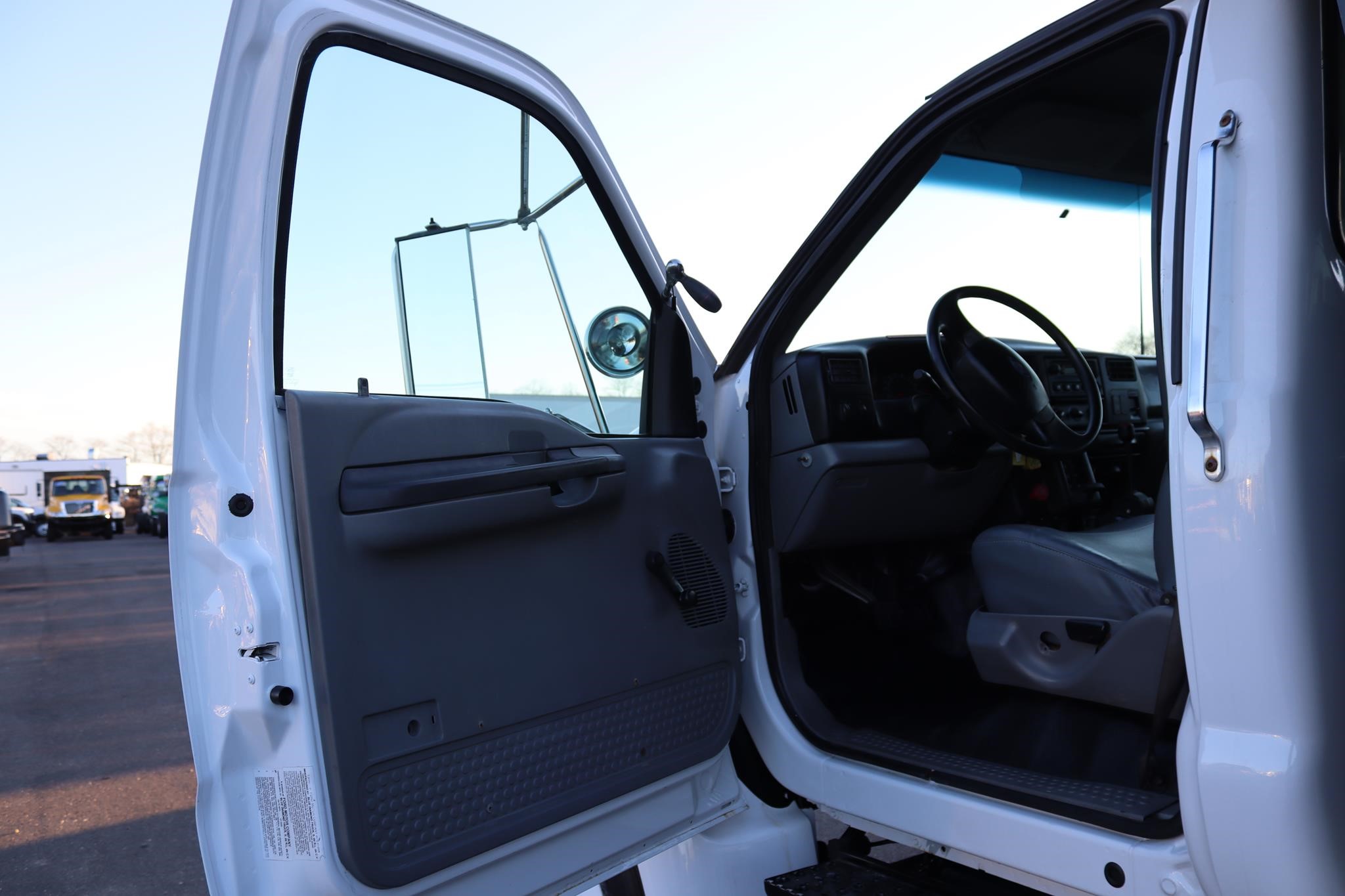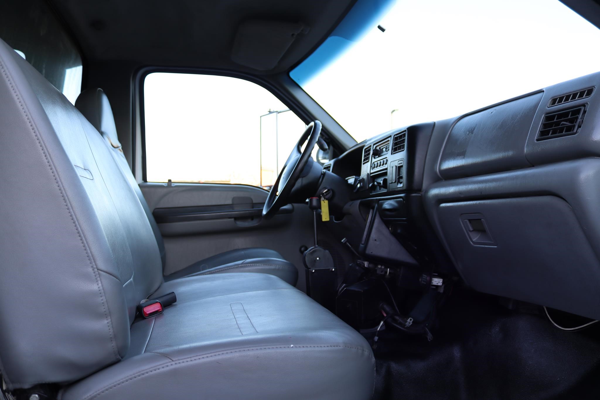 The interior features split bench seats, tilt, cruise control, work lights, A/C, AM/FM radio, trailer brake, and air brakes.