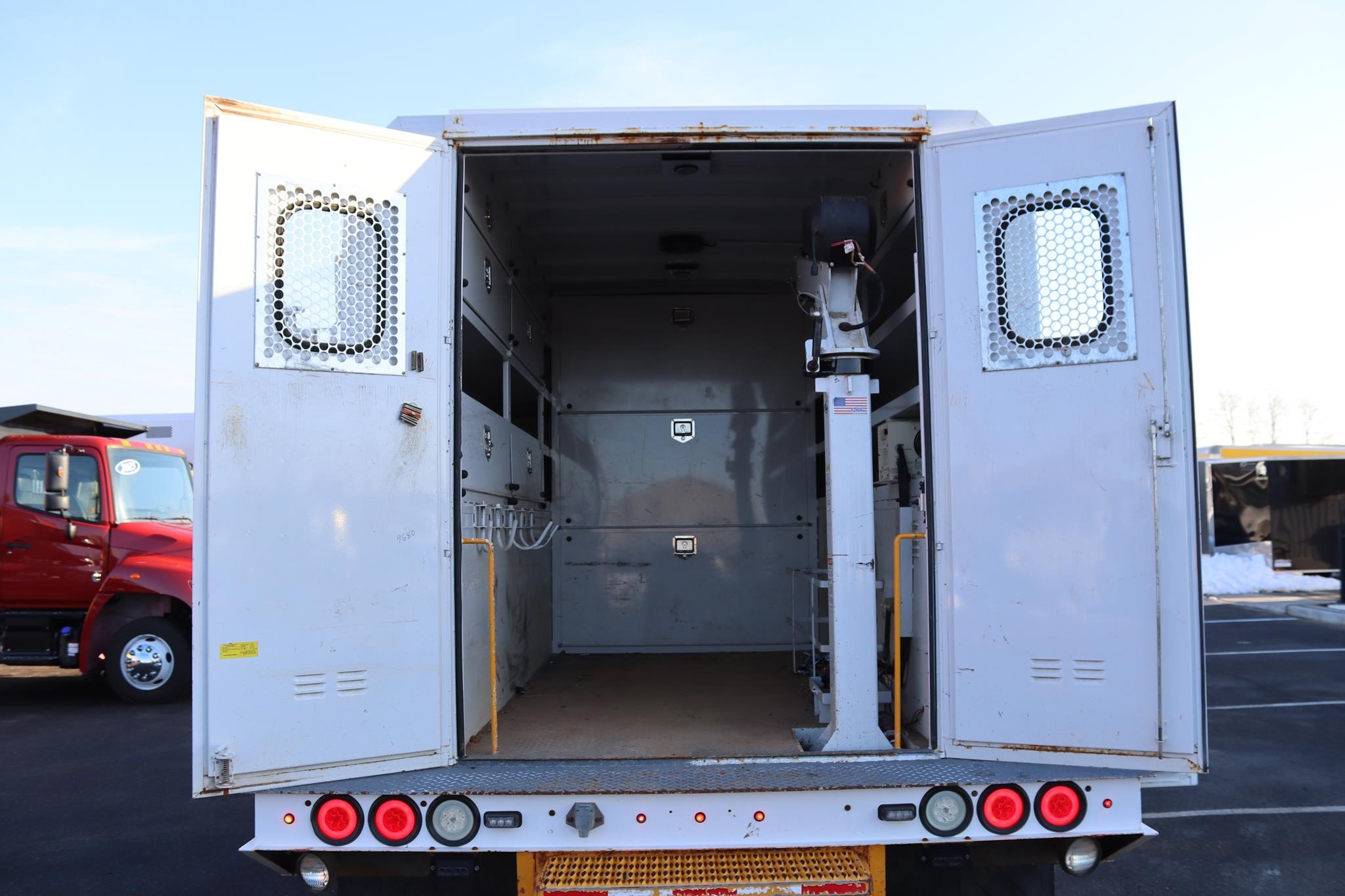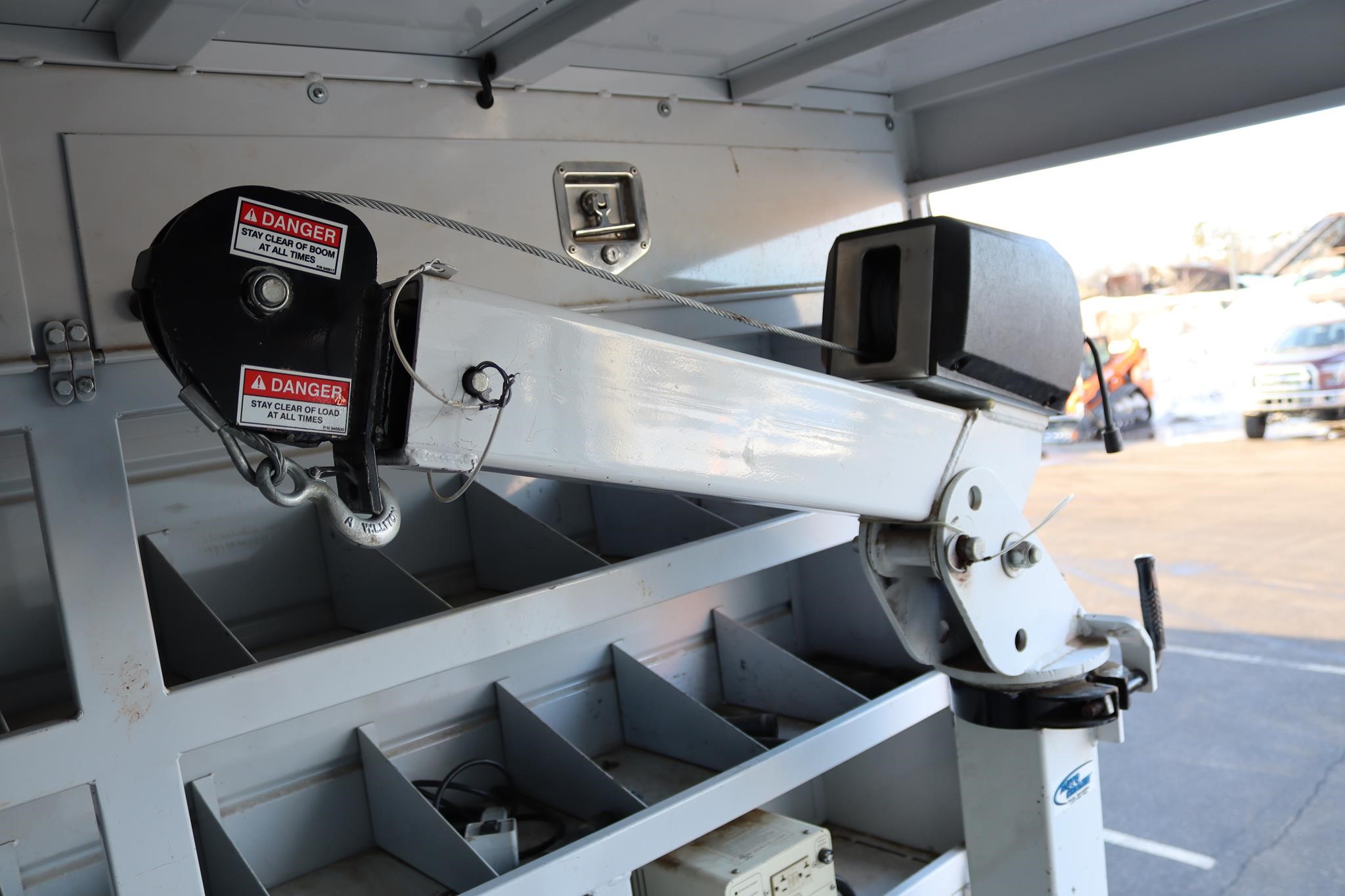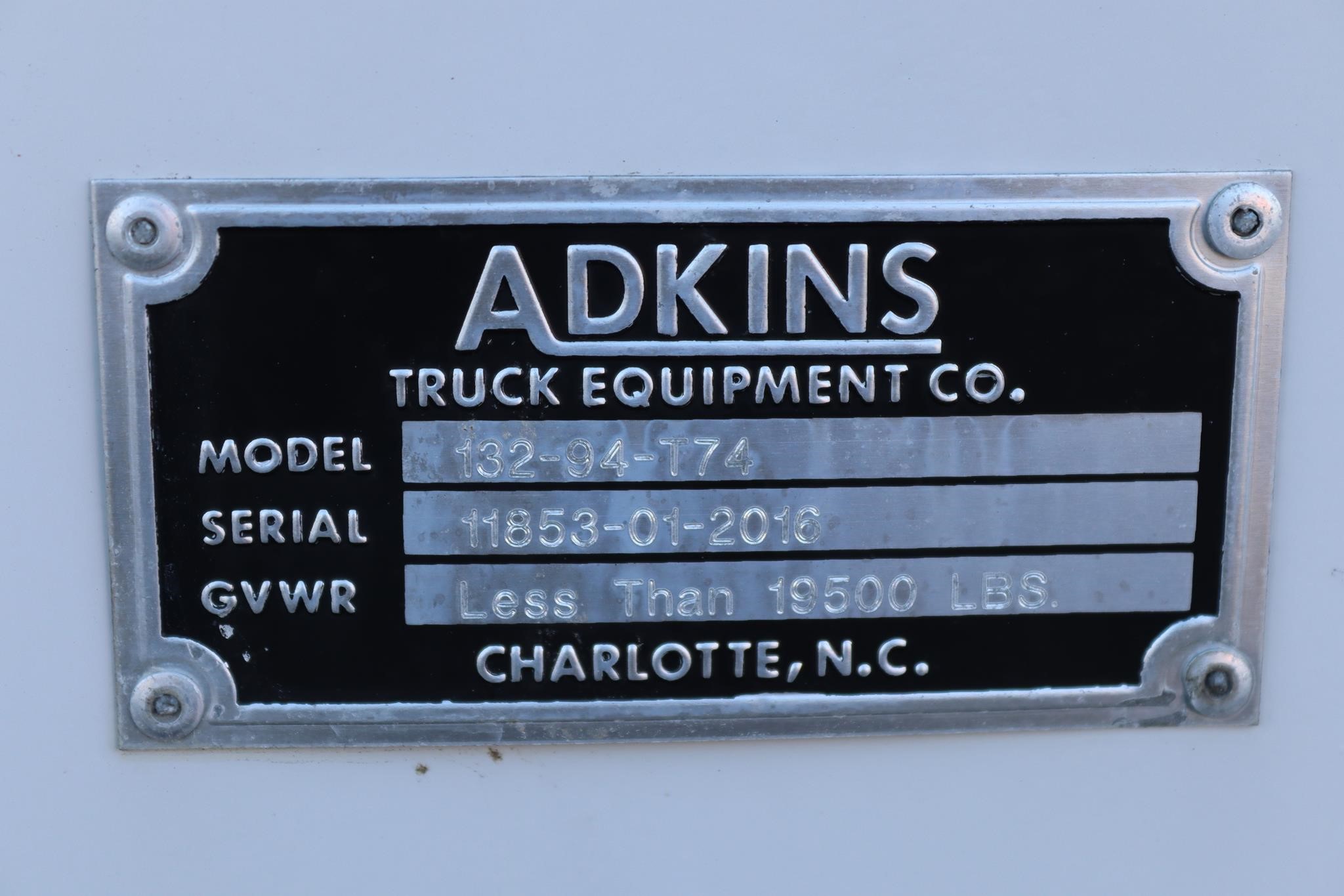This commercial truck comes equipped with an Adkins 11′ Enclosed Utility Body (Serial # – 11853-01-2016 / Model # – 132-94-T74) that is equipped with swing doors, an auto crane, inverter, receiver hitch, and 7-way round plug in rear.