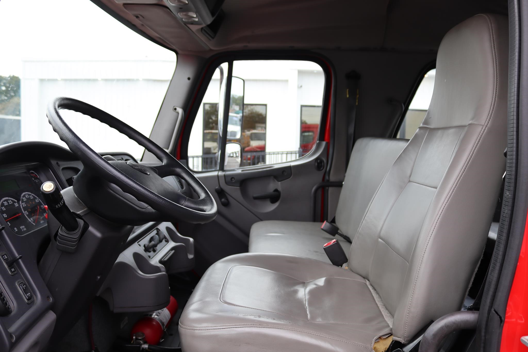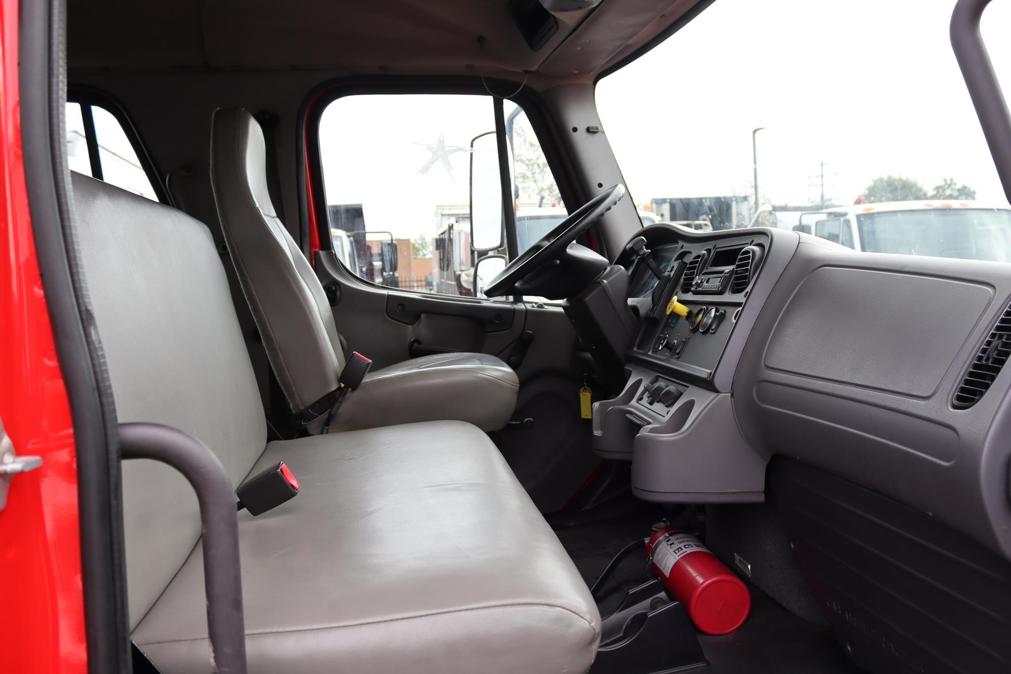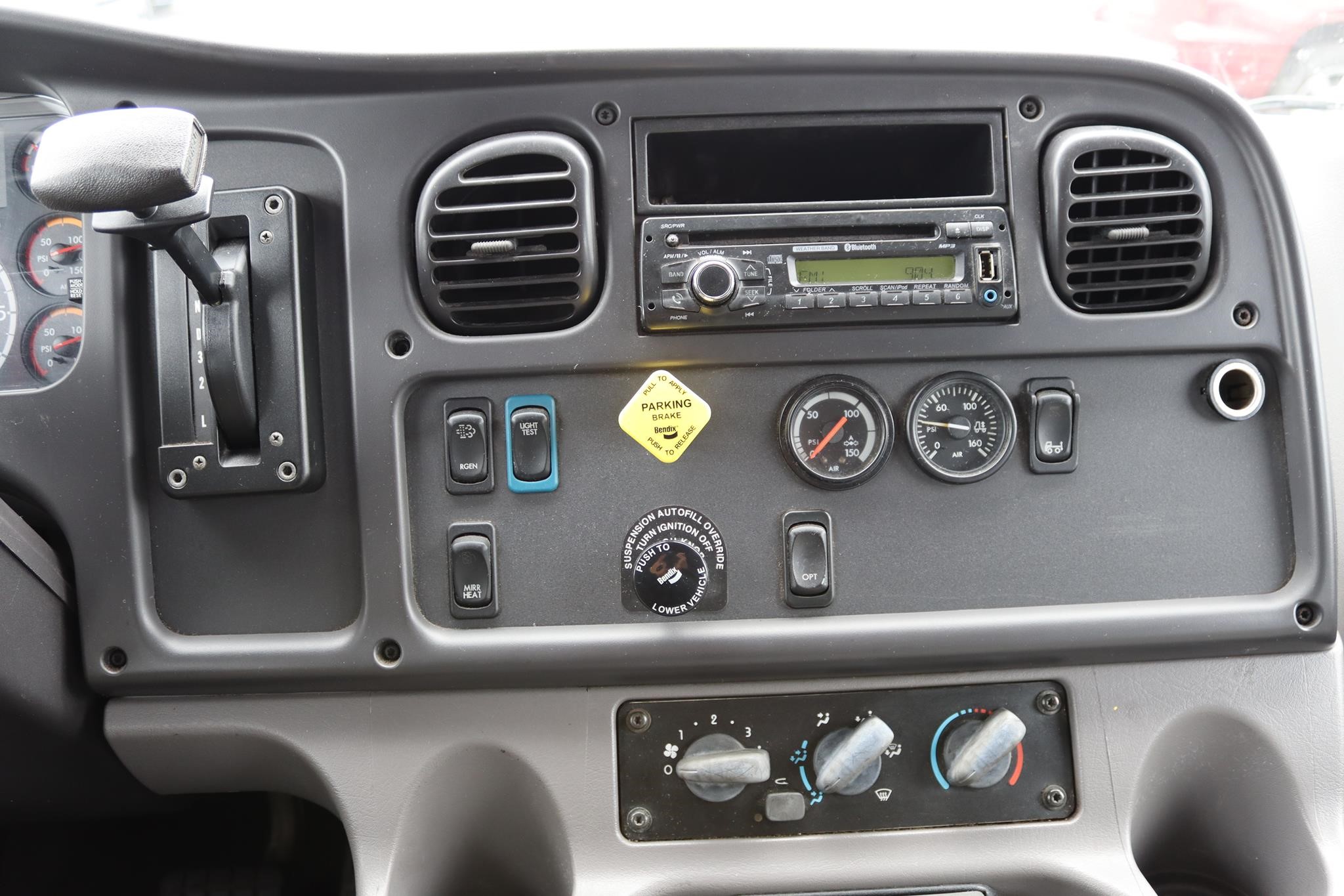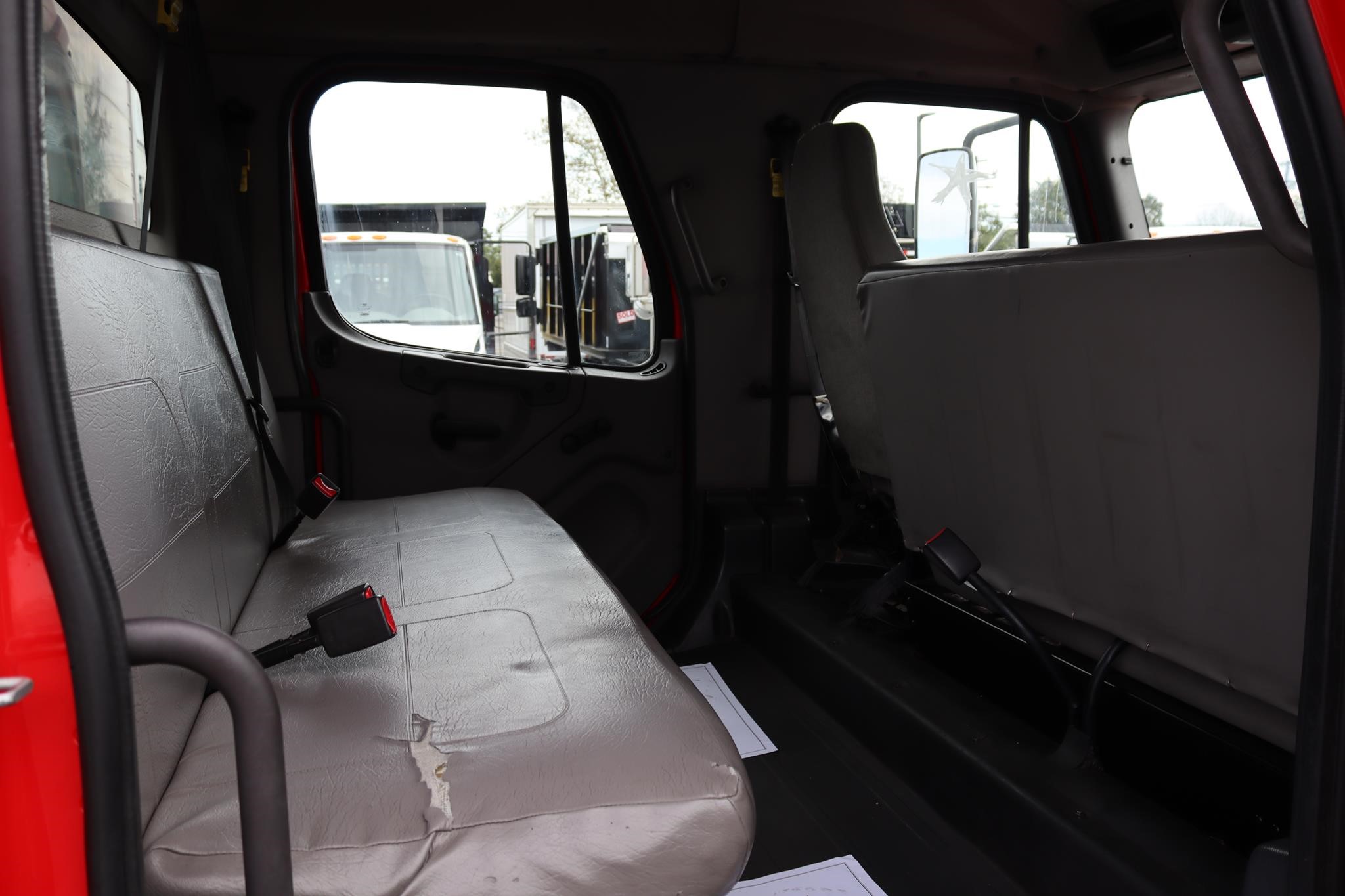 The interior features split bench seats, an air-ride driver’s seat, cruise control, A/C, AM/FM radio, heated mirrors, and air brakes.