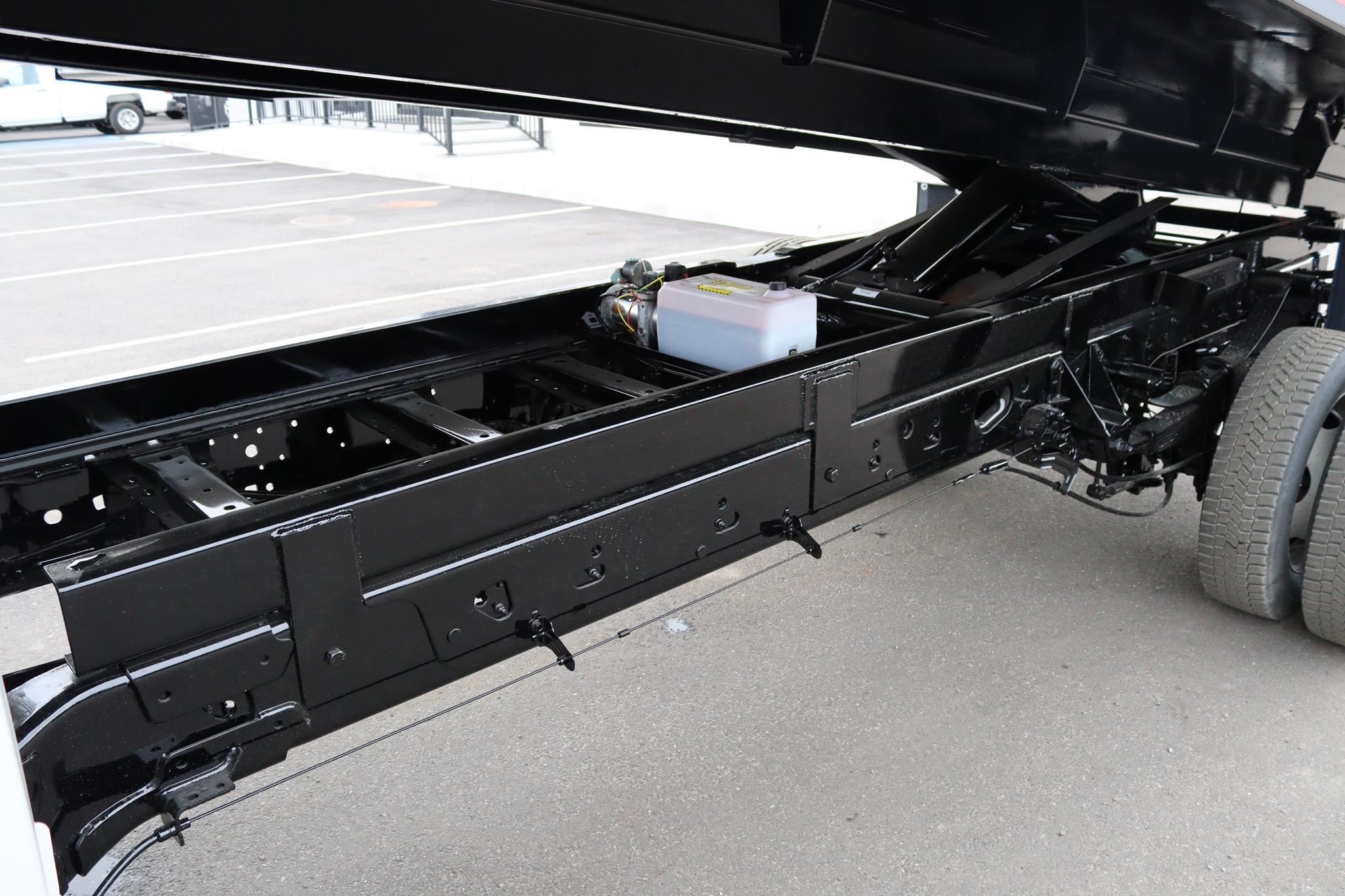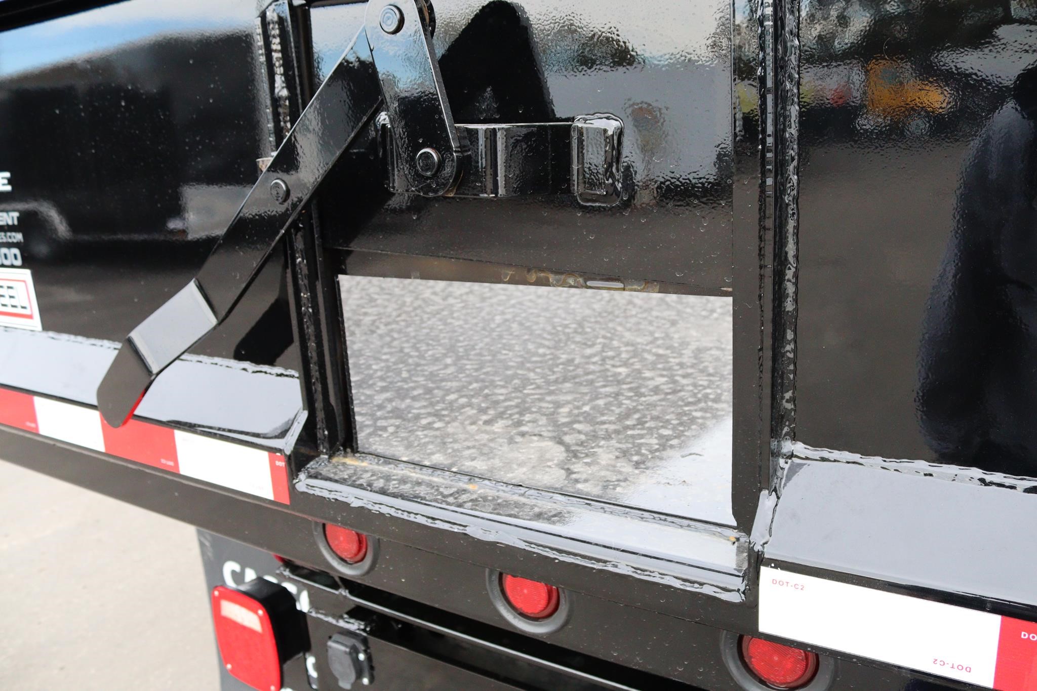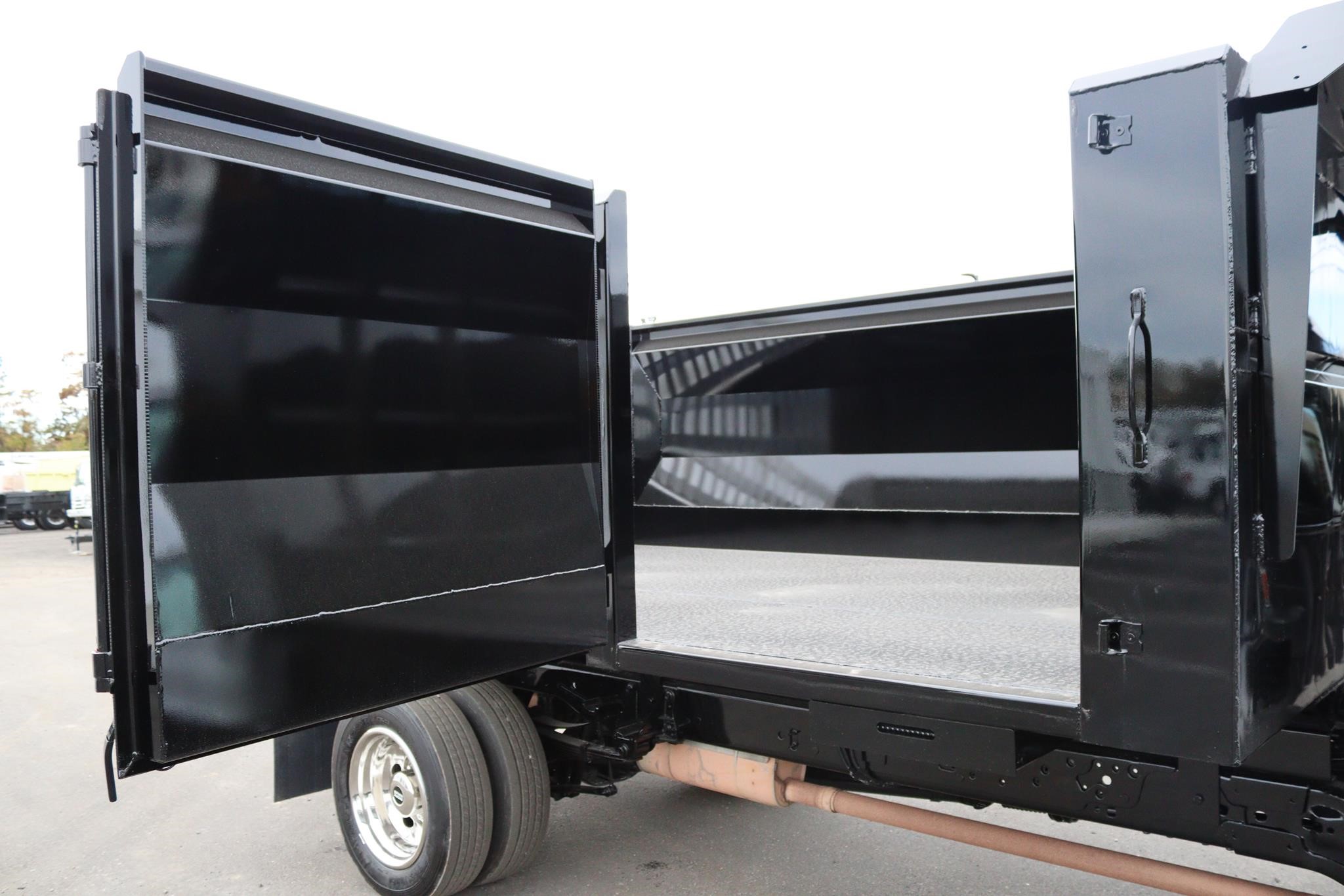 This commercial truck comes equipped with a Brand-New Crysteel 14′ Landscape body (Serial # – 41224698) that has 50” sides, 40″ cab protector, 15″ x 7″ centered chute, a curb side swing door with step, rear swing door with aluminum ramp and two-way gate, and is equipped with an 8-ton combination hitch and 7-way flats plug in the rear. The hoist is a TBEI (Serial # – 2286030).
