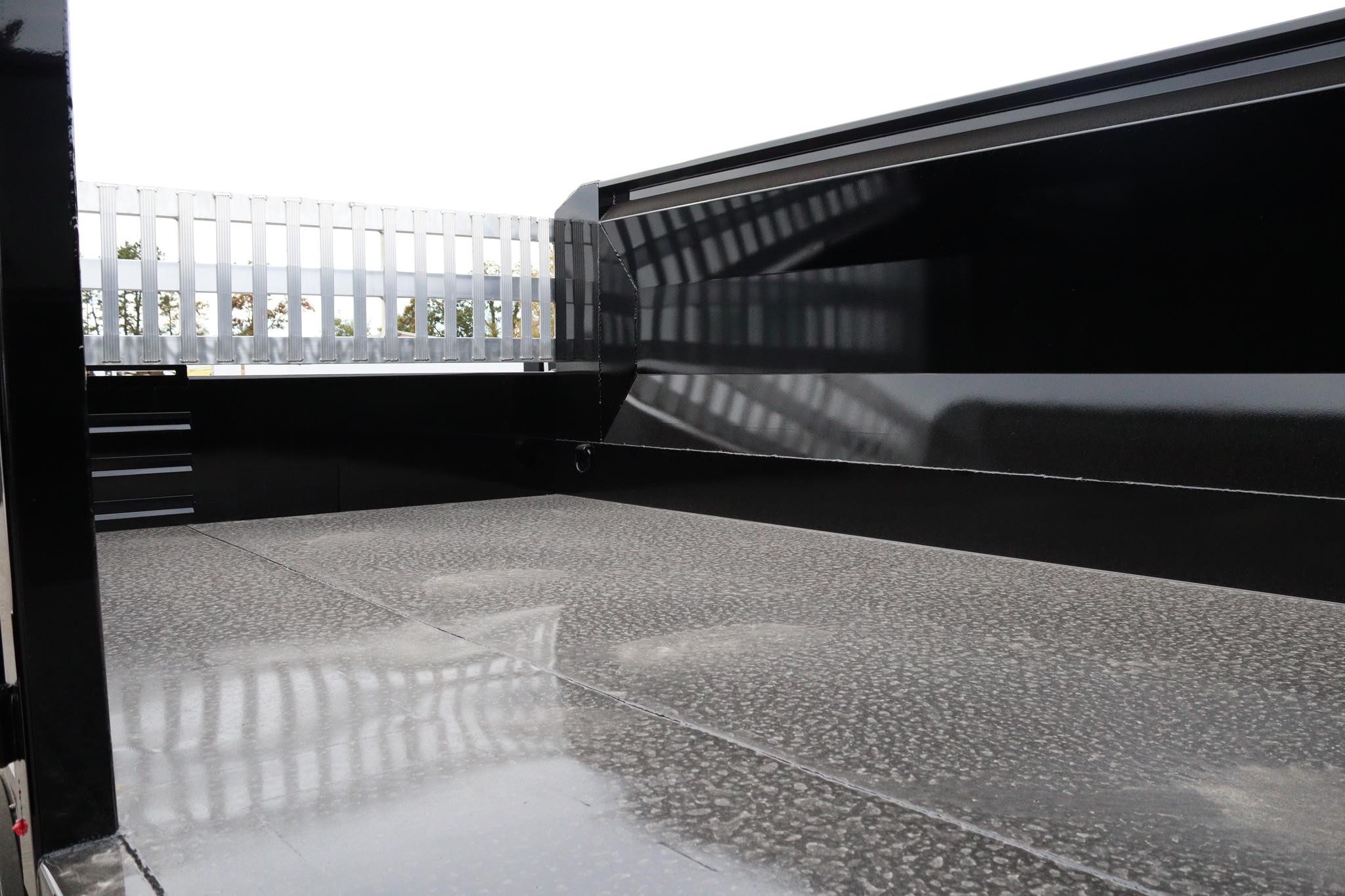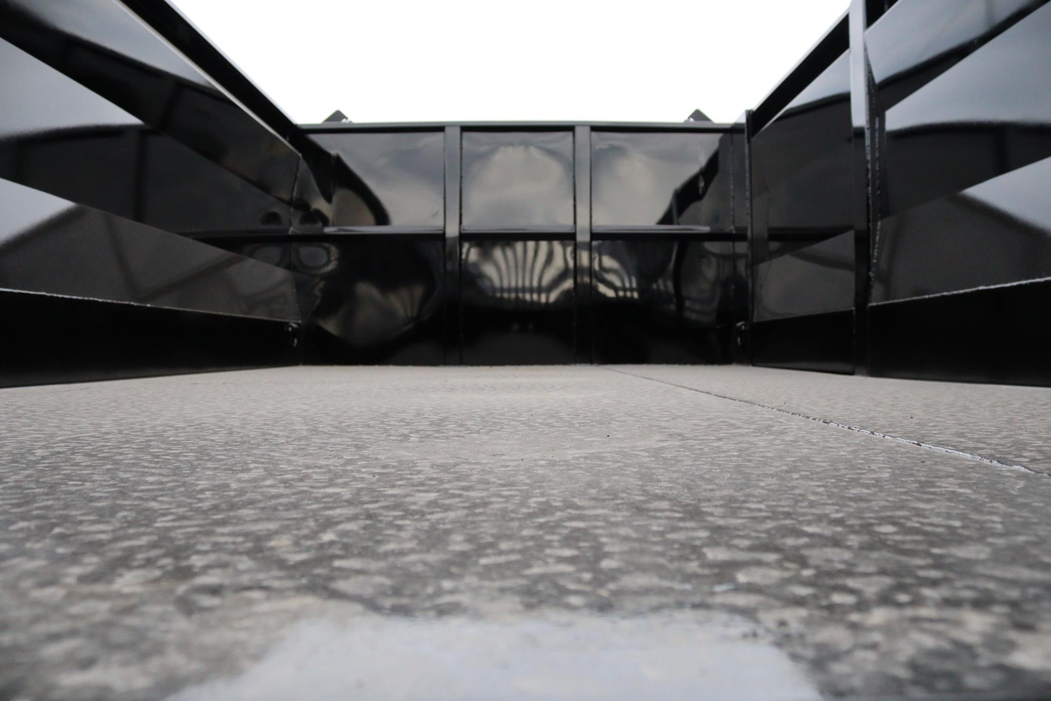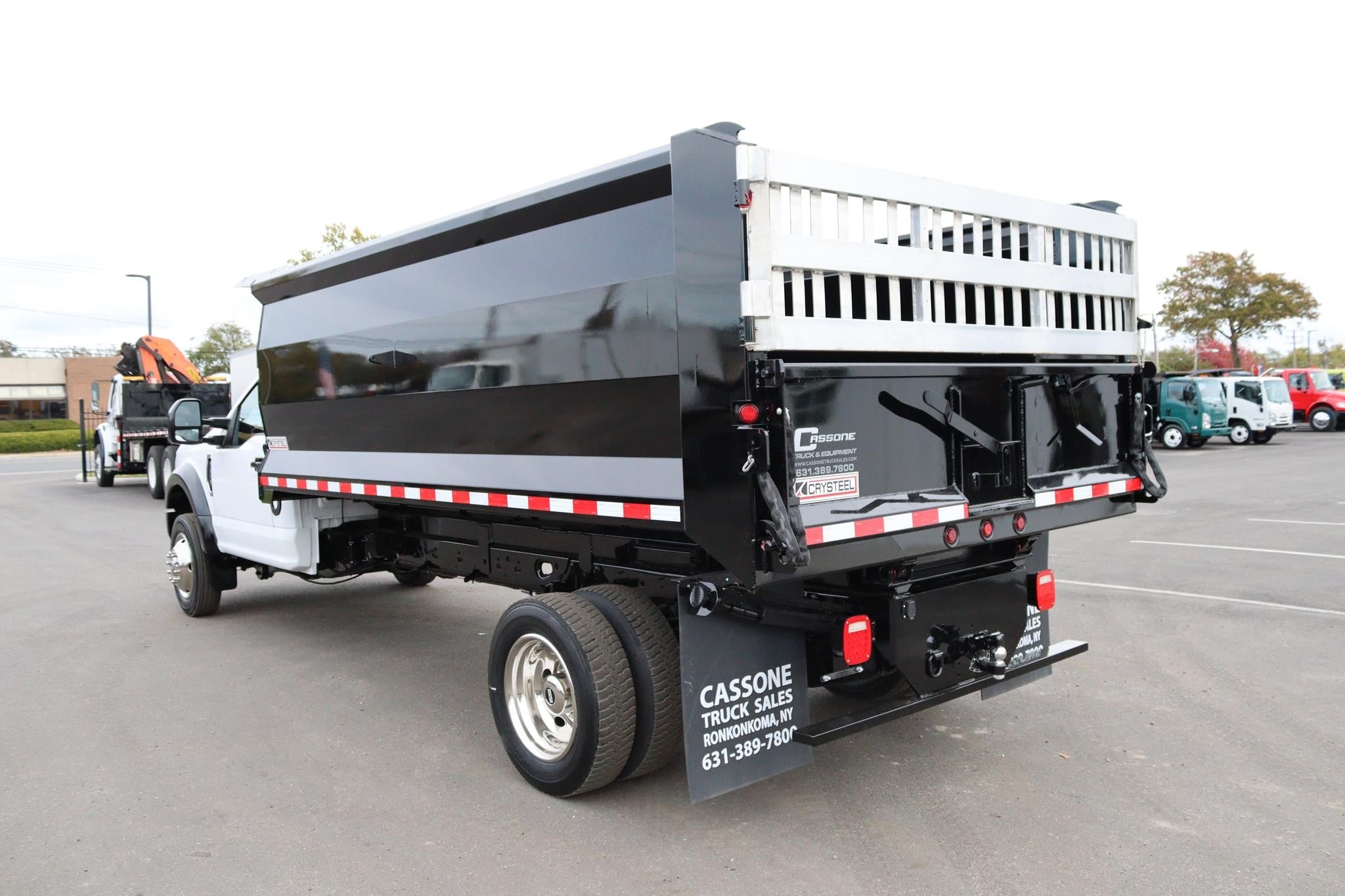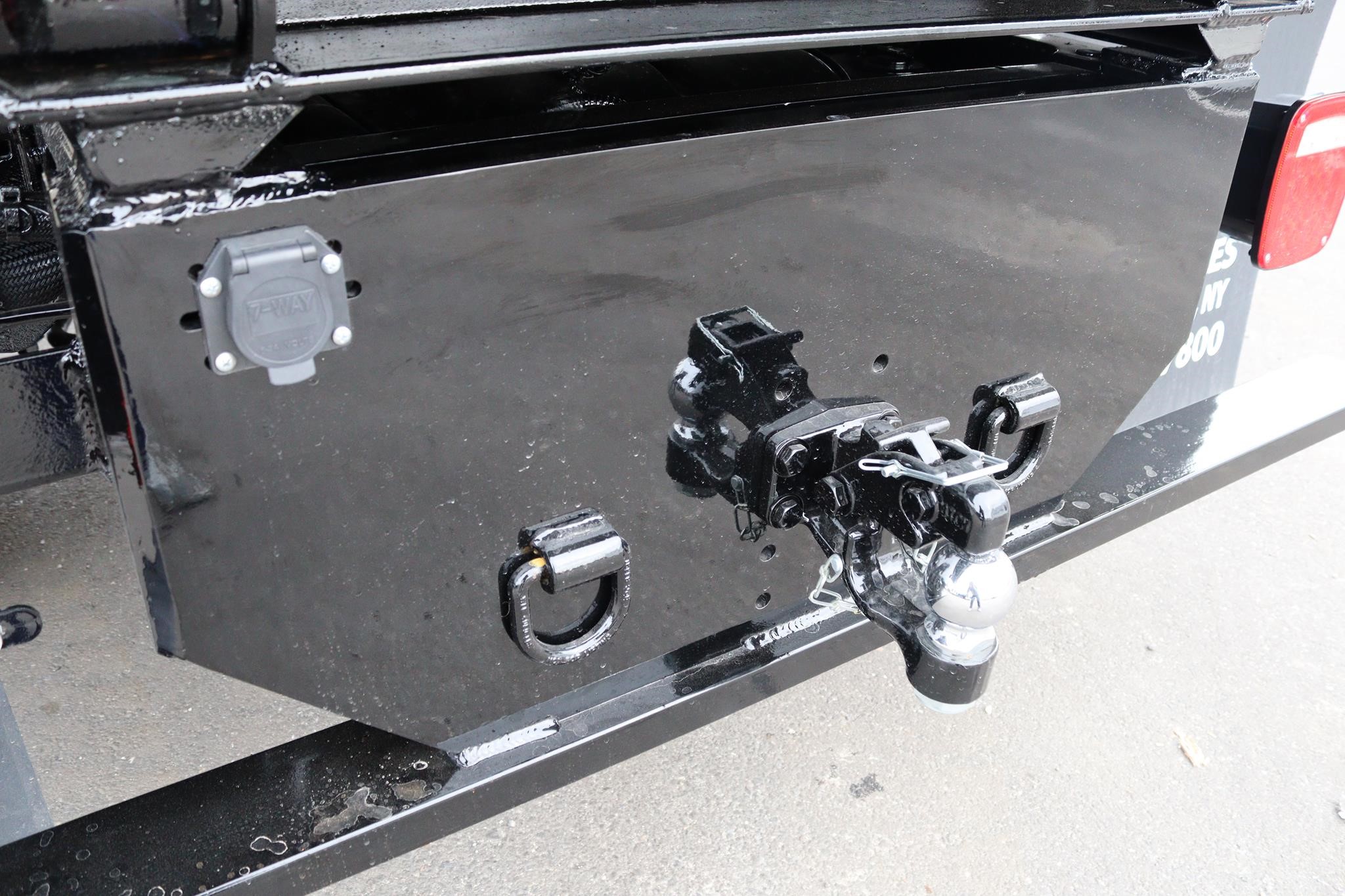 This commercial truck comes equipped with a Brand-New Crysteel 14′ Landscape body (Serial # – 41224698) that has 50” sides, 40″ cab protector, 15″ x 7″ centered chute, a curb side swing door with step, rear swing door with aluminum ramp and two-way gate, and is equipped with an 8-ton combination hitch and 7-way flats plug in the rear. The hoist is a TBEI (Serial # – 2286030).