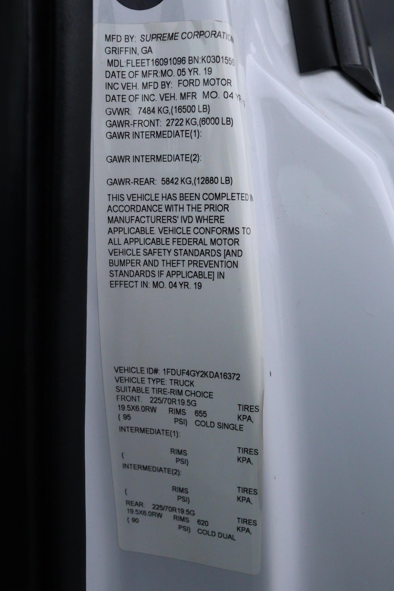 VIN# – 1FDUF4GY2KDA16372