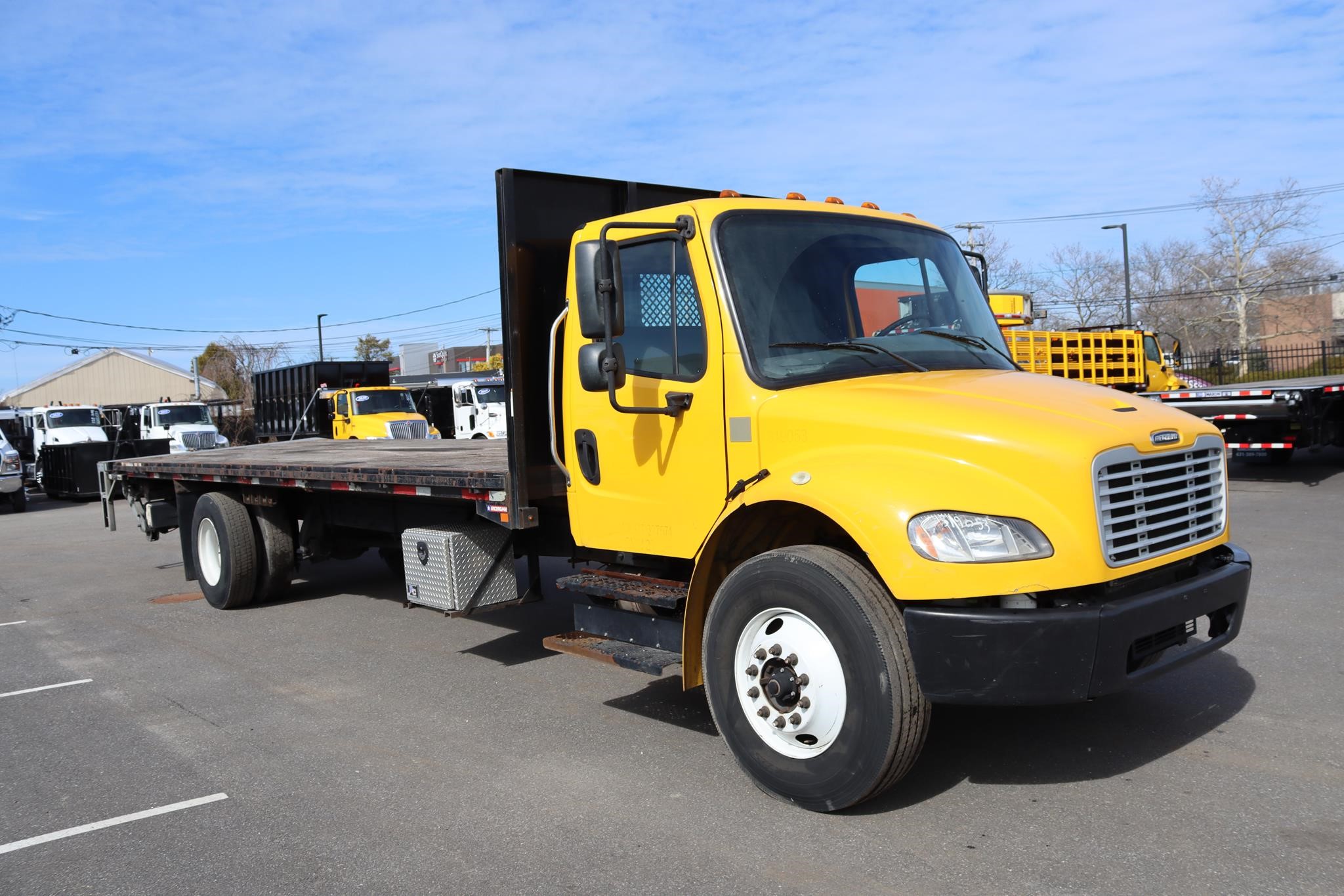You’re viewing a 2019 Freightliner M2 106 Non-CDL 26′ Flatbed Truck #KB9136. The truck is powered by a 220HP Cummins B6.7L diesel engine and an Eaton automatic transmission with 153,195 miles and 5,292 hours on the odometer. The Freightliner is equipped with an air ride suspension, 22.5″ tires, and steel rims.