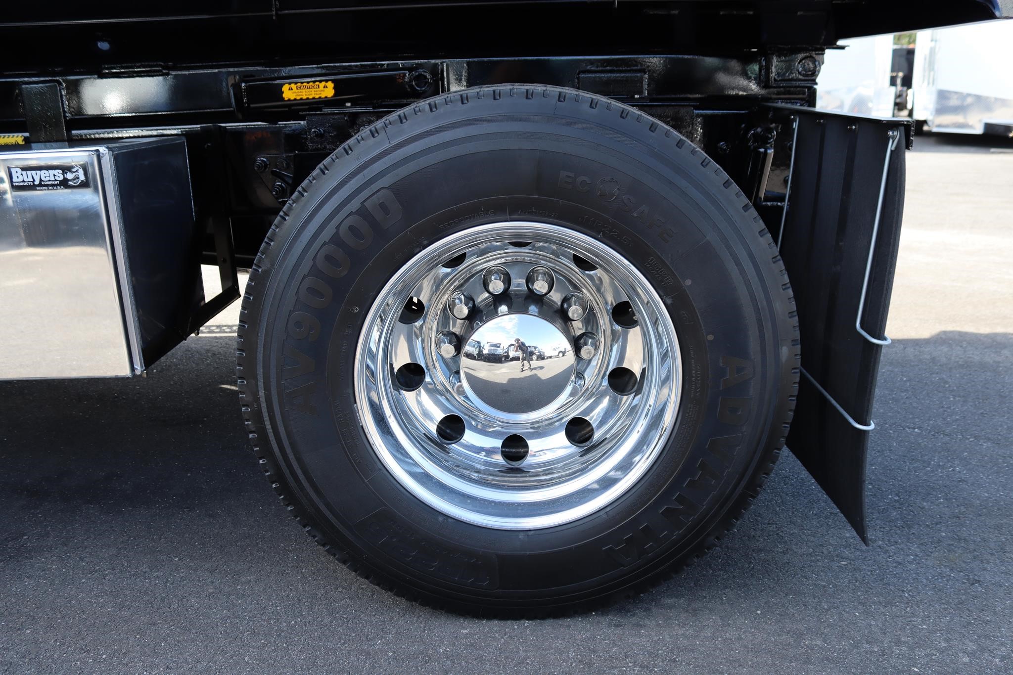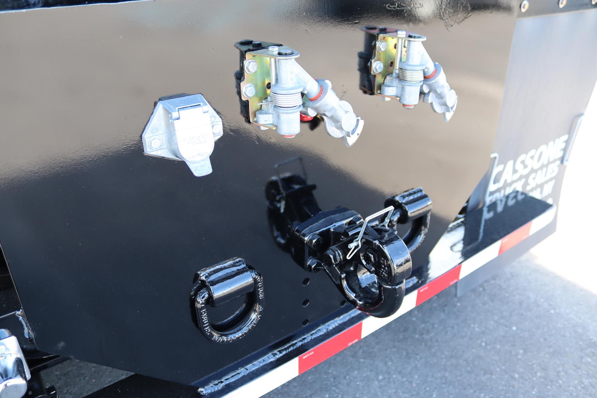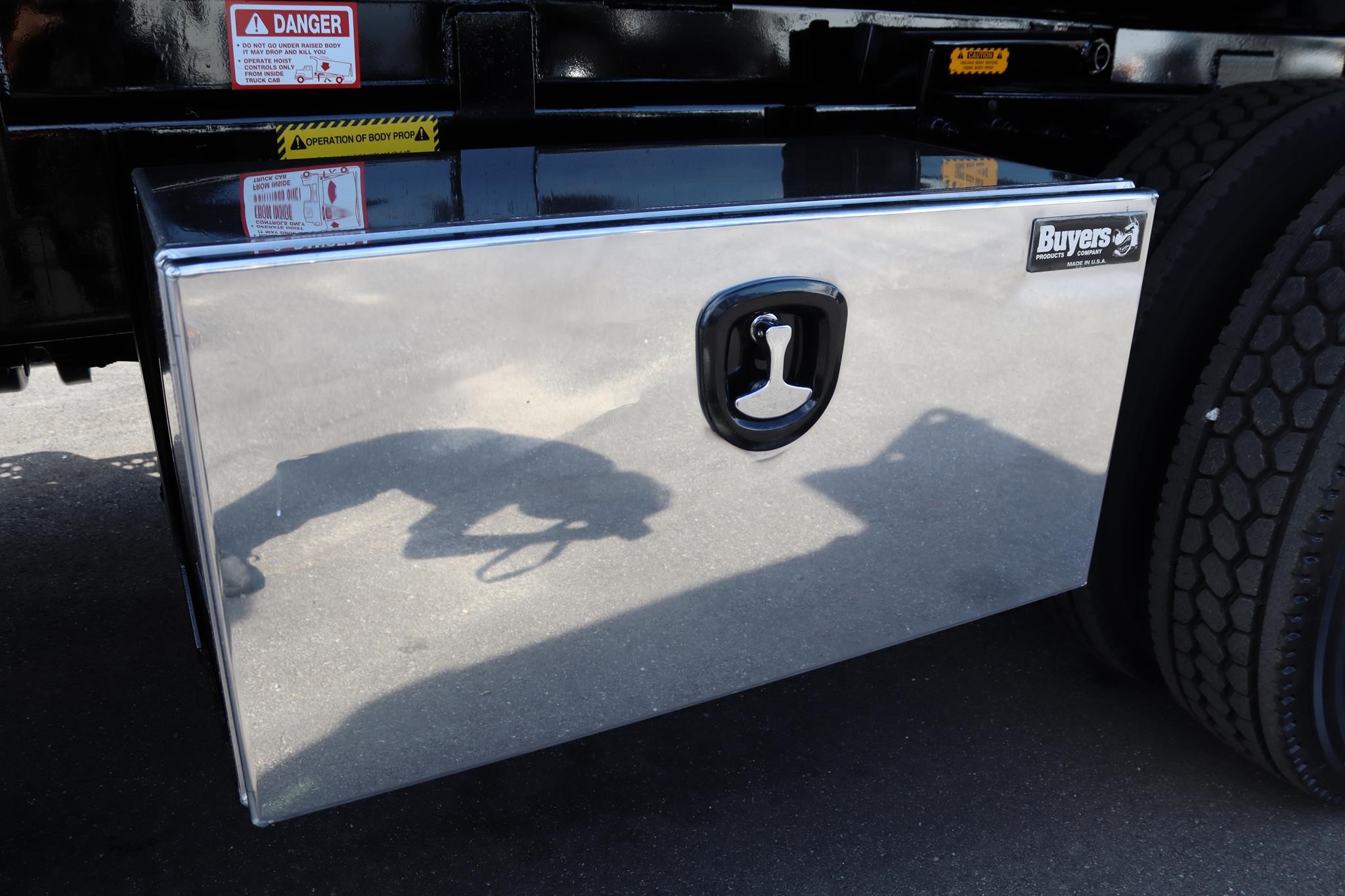 This commercial truck comes equipped with a Brand-New Crysteel 10′ Mason body (Serial # – 41226419) that has 30″ sides, 26″ cab protector, 18″ x 12″ centered chute, and is equipped with a Shurco Tarp system, a Buyers toolbox that measures 36X18X18″, a 20-ton pintle hitch with air to the rear, and 7-way rounds plug in.