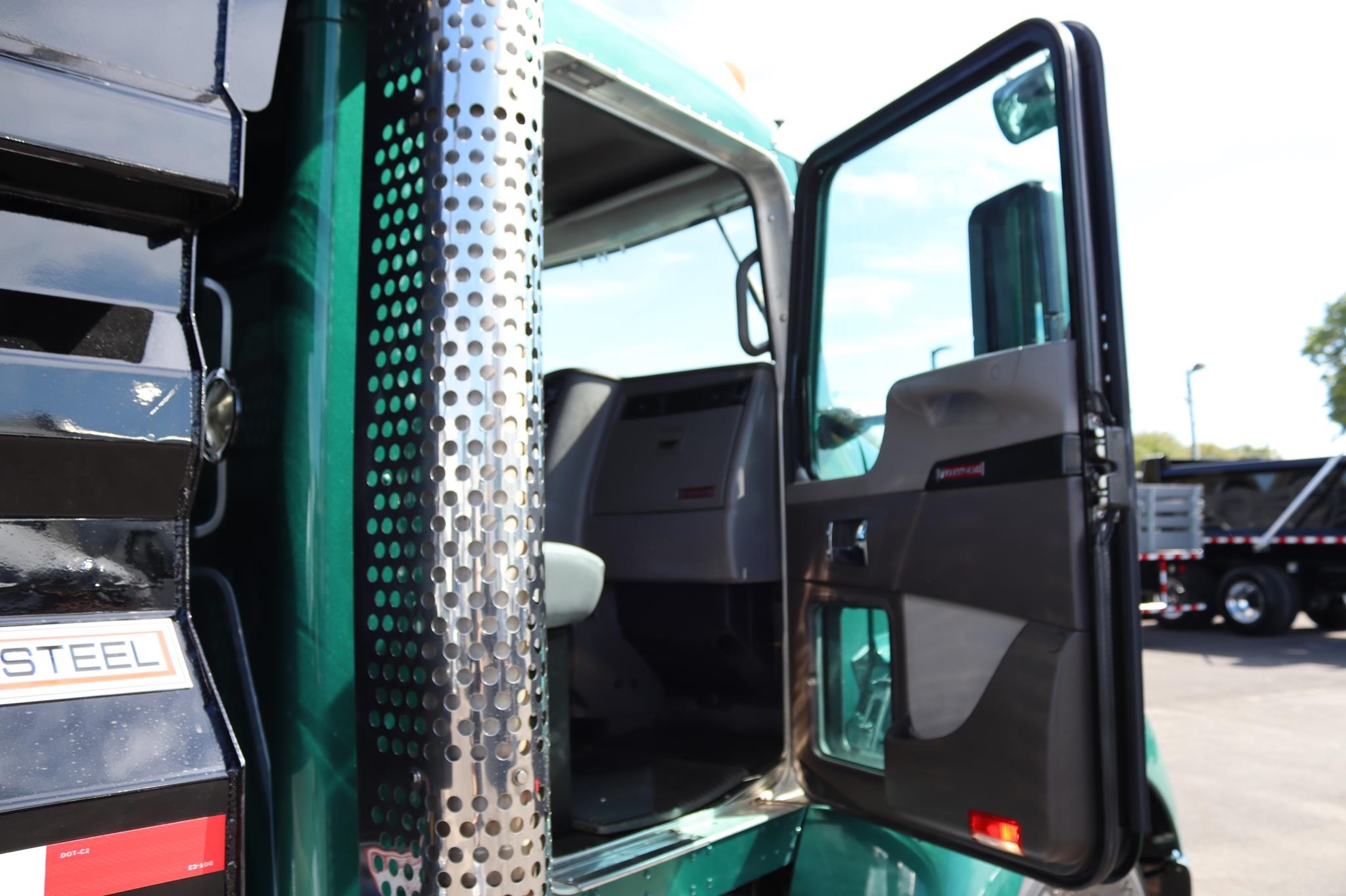 The interior features two bucket seats, an air ride driver seat, cruise control, heated mirrors, tilt, A/C, AM/FM/BT radio, power locks, power windows, tilt-tele, traction control, engine brake, and air brakes.