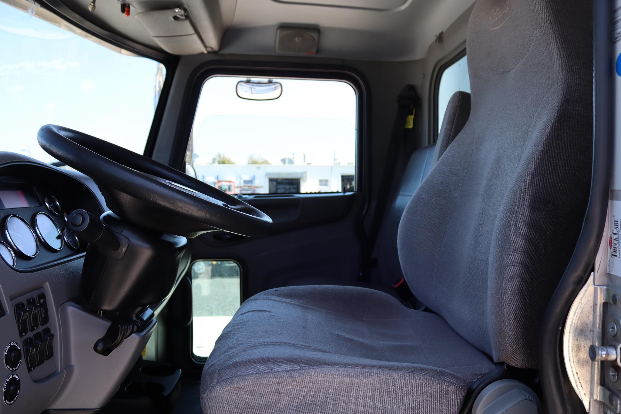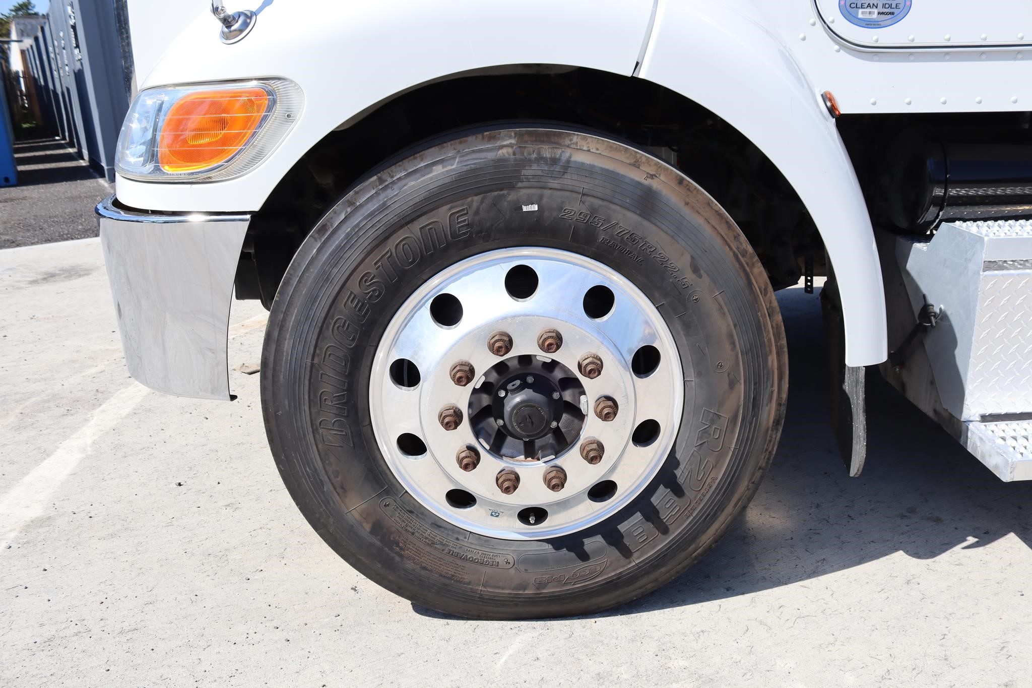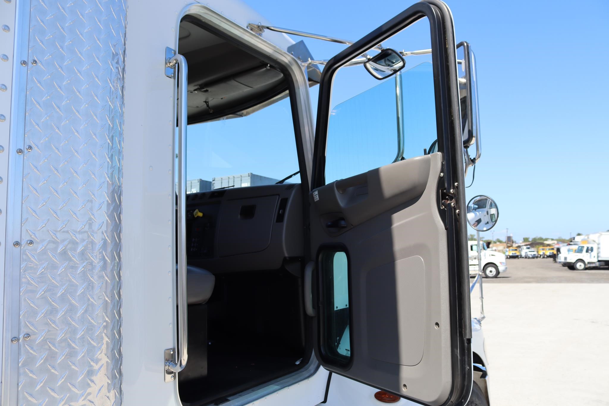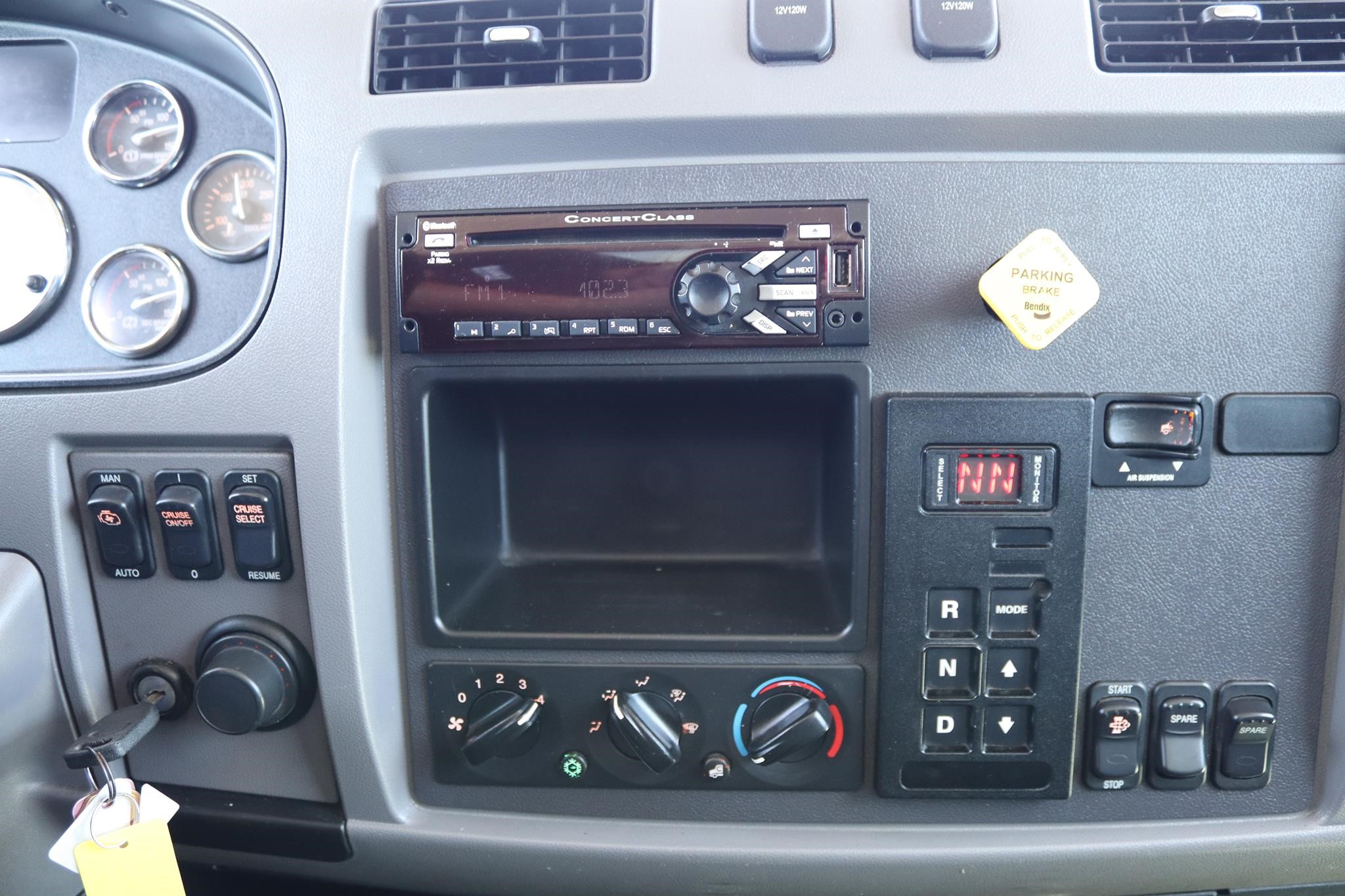The interior features split bench seats, an air ride driver seat, cruise control, A/C, AM/FM/BT radio, heated mirrors, power locks, and power windows. This truck sits on an air ride suspension and 22.5 tires with aluminum rims.