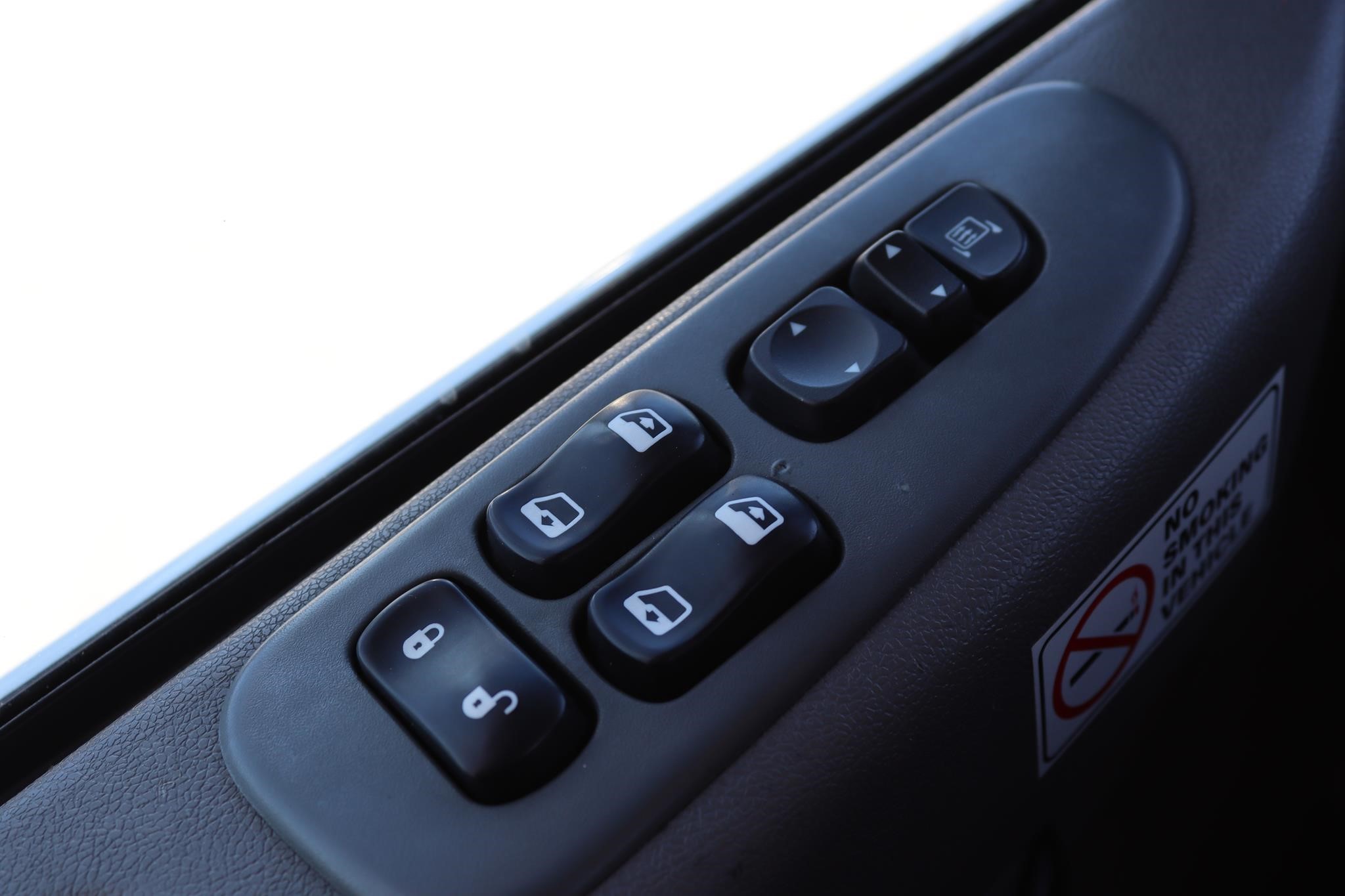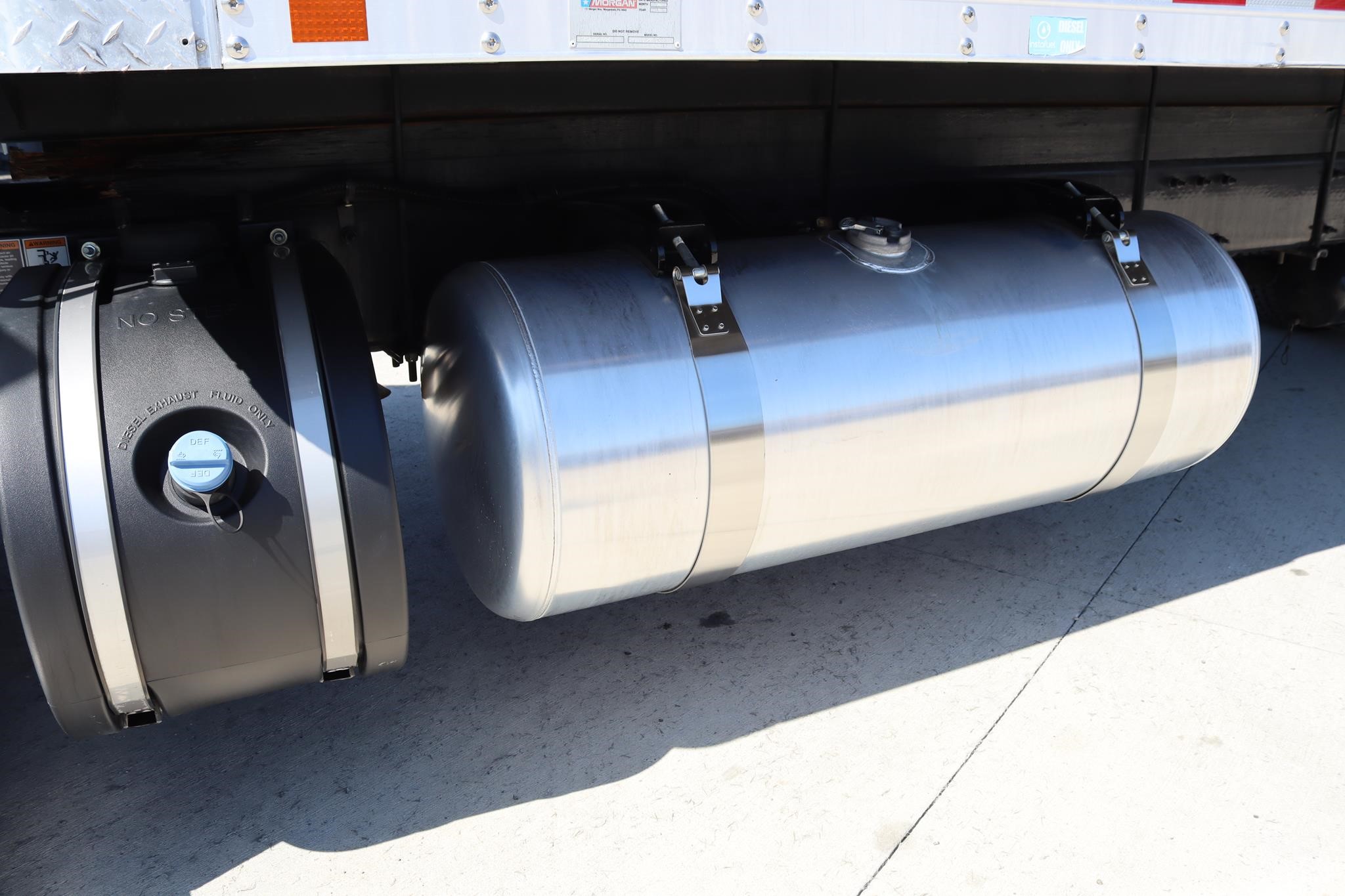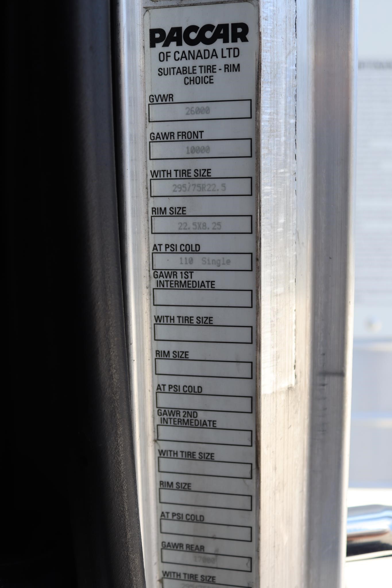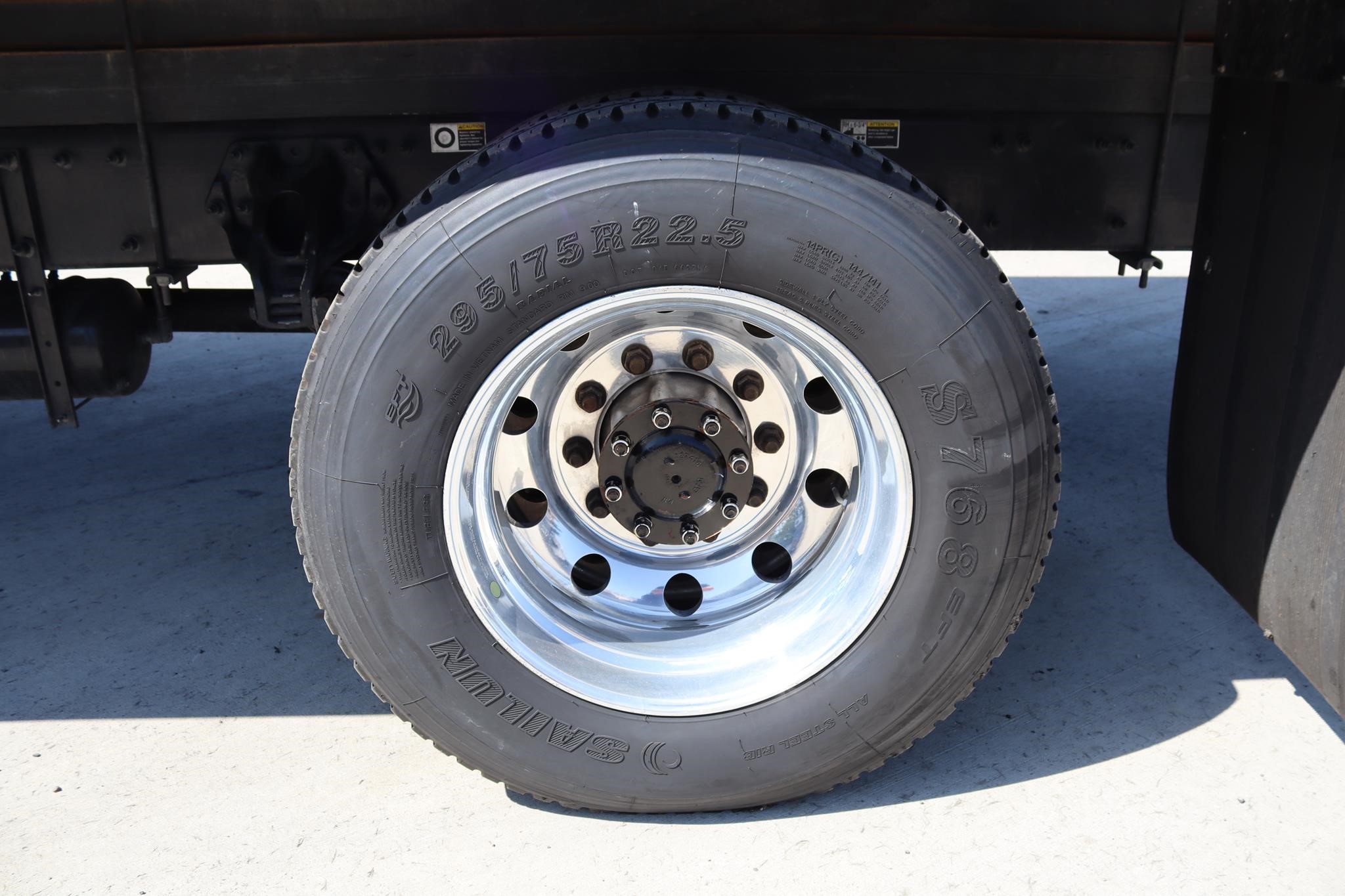 The interior features split bench seats, an air ride driver seat, cruise control, A/C, AM/FM/BT radio, heated mirrors, power locks, and power windows. This truck sits on an air ride suspension and 22.5 tires with aluminum rims.