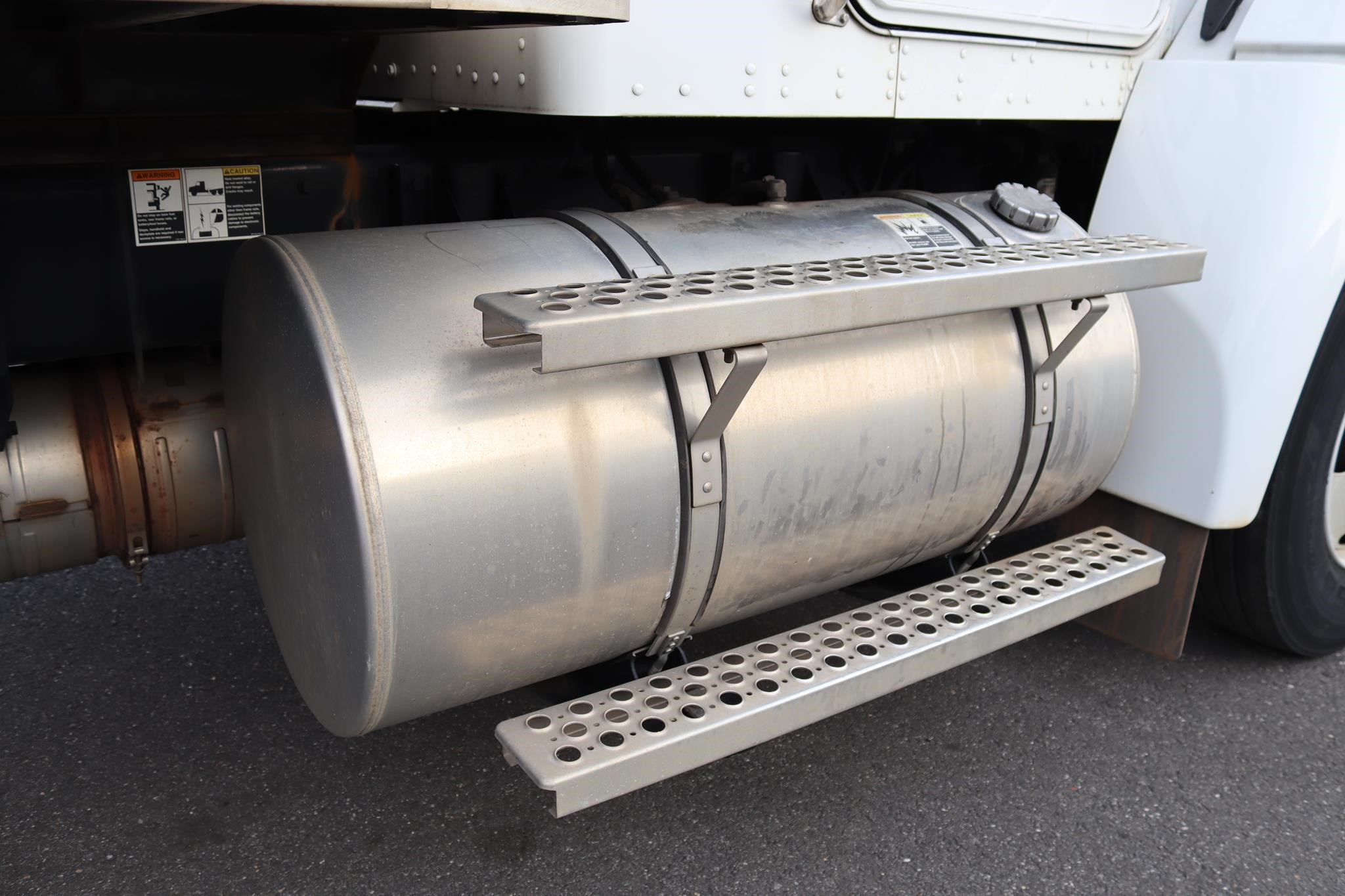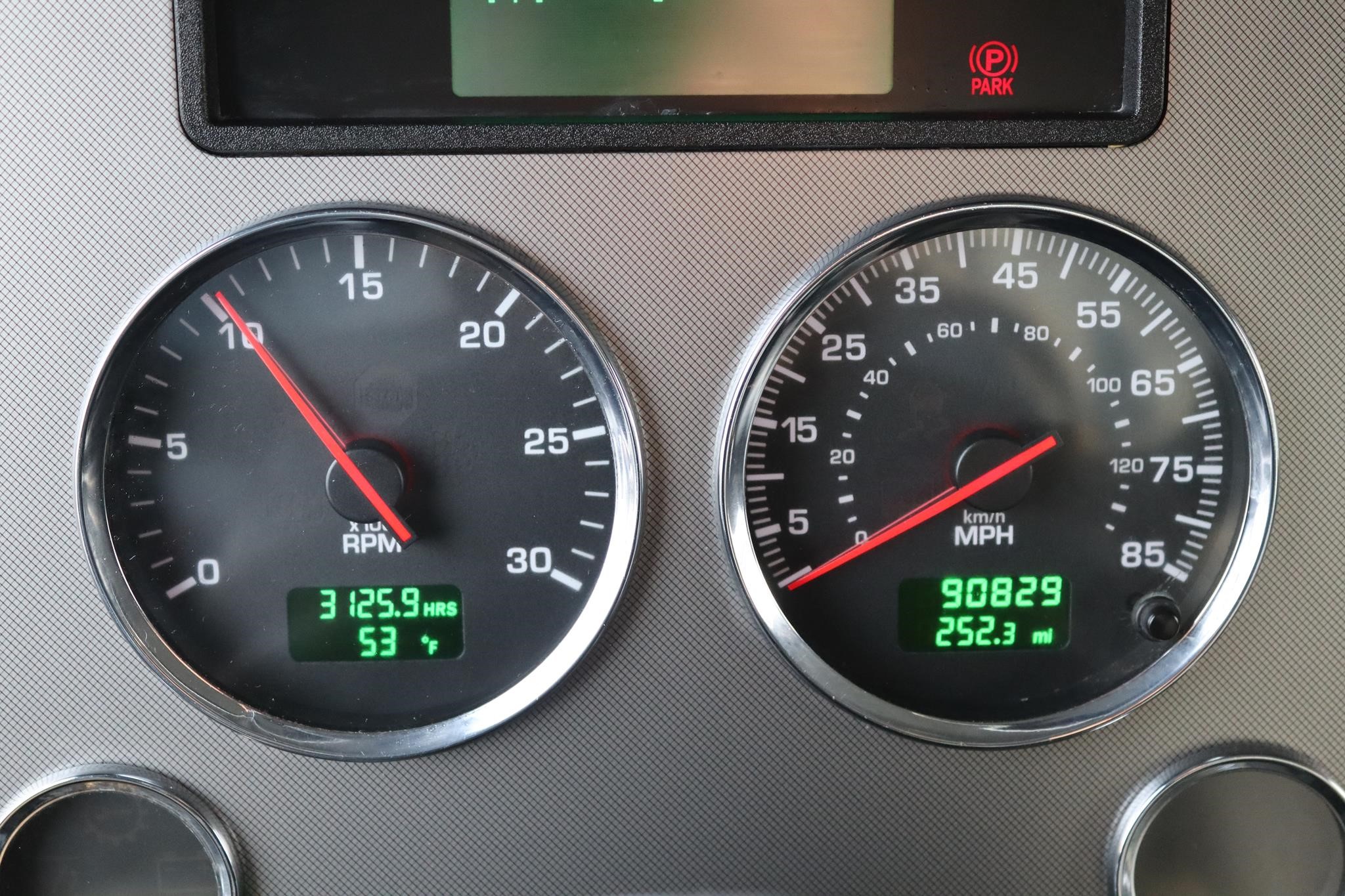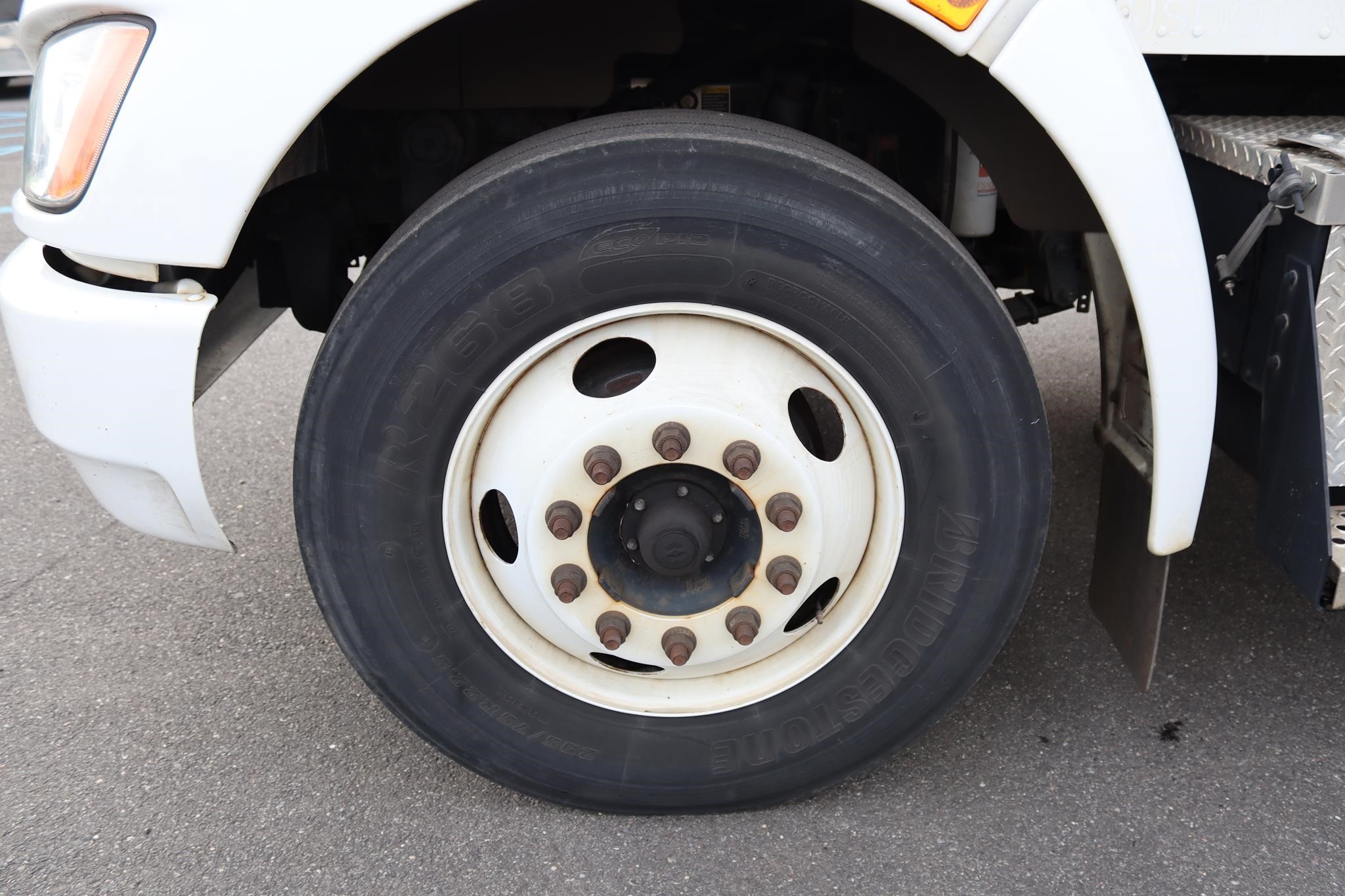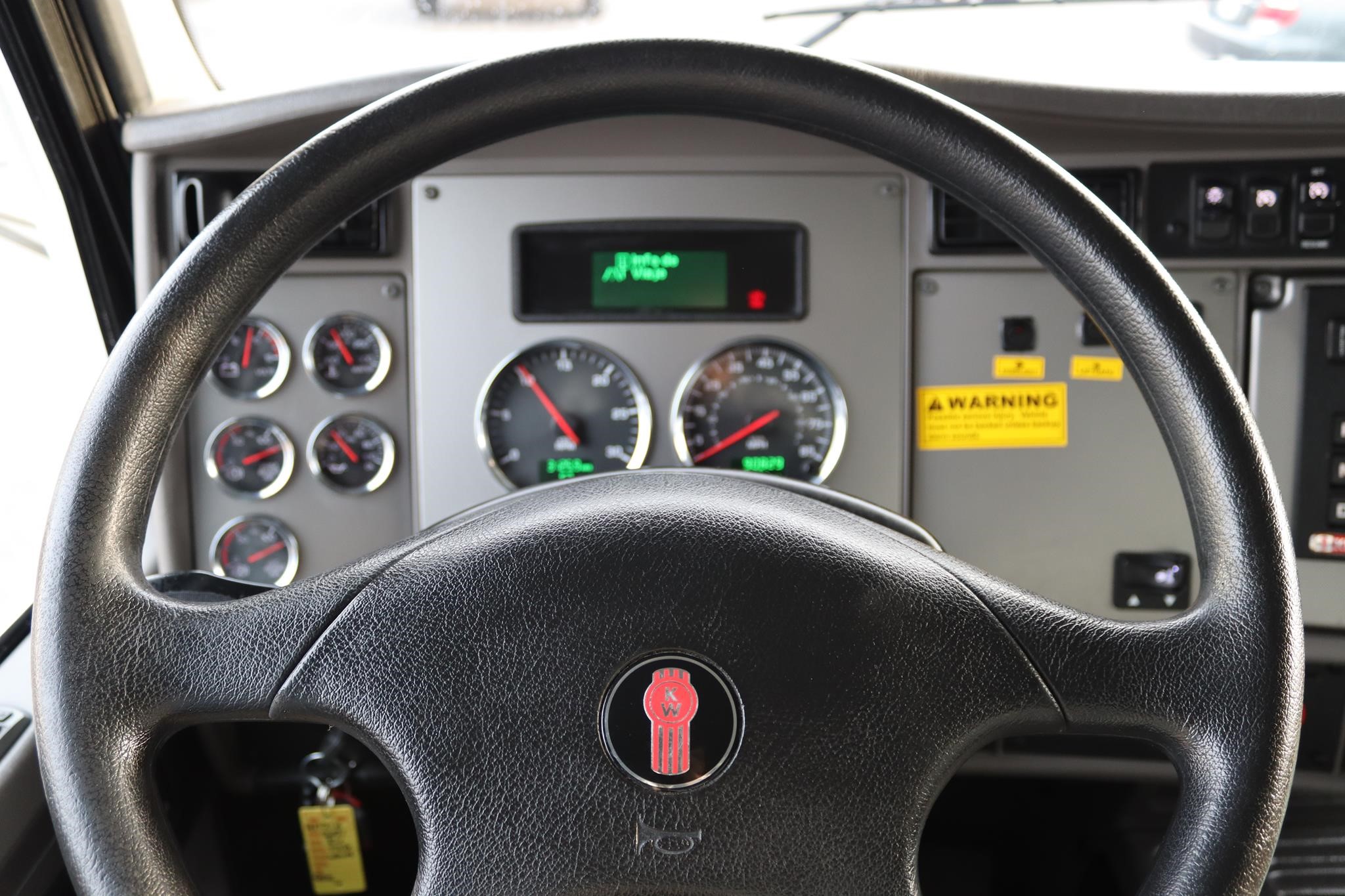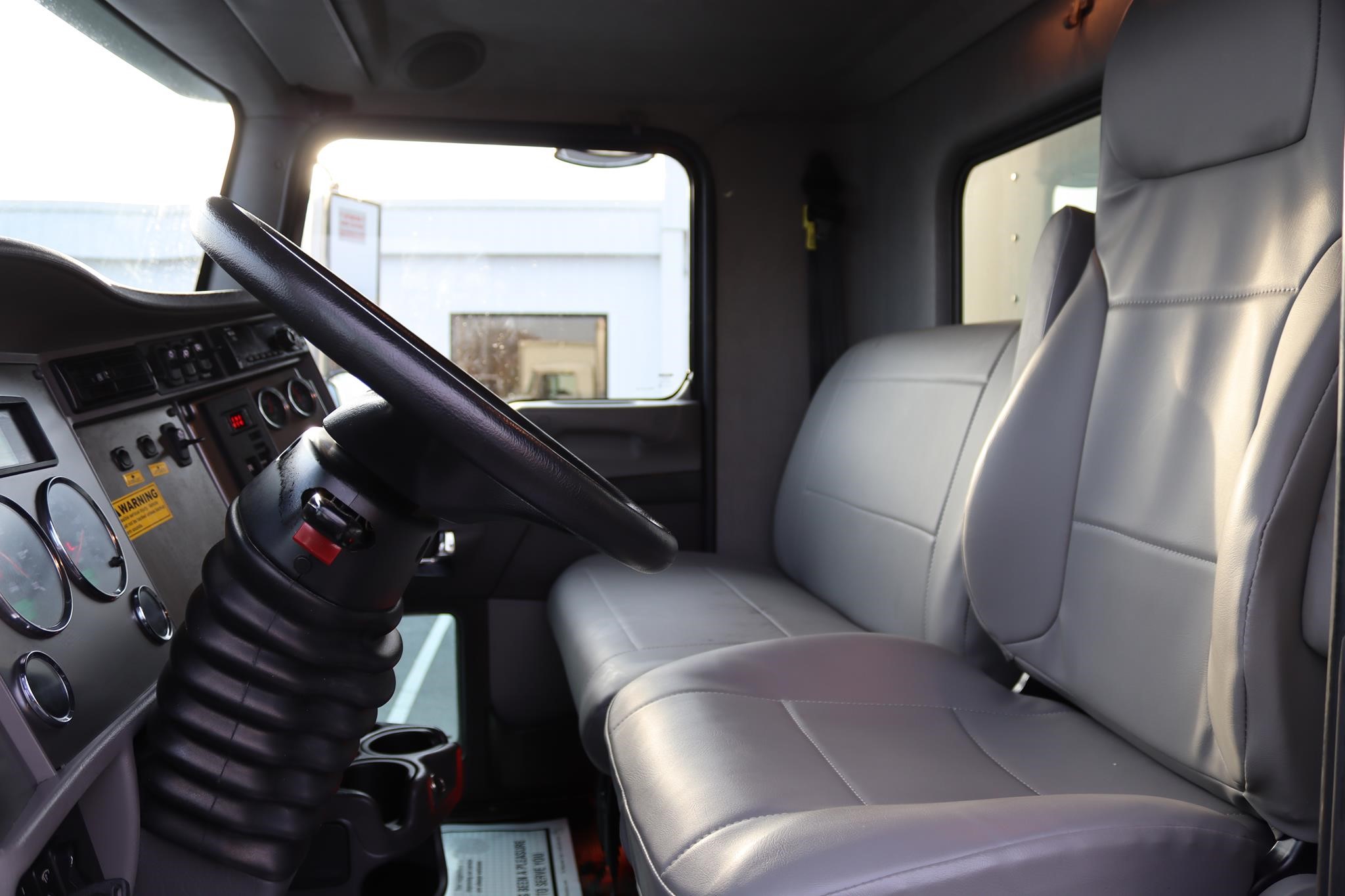 The interior features split bench seats, an air ride driver seat, cruise control, A/C, AM/FM/BT radio, heated mirrors, air brakes, tilt-tele, and exhaust brake.