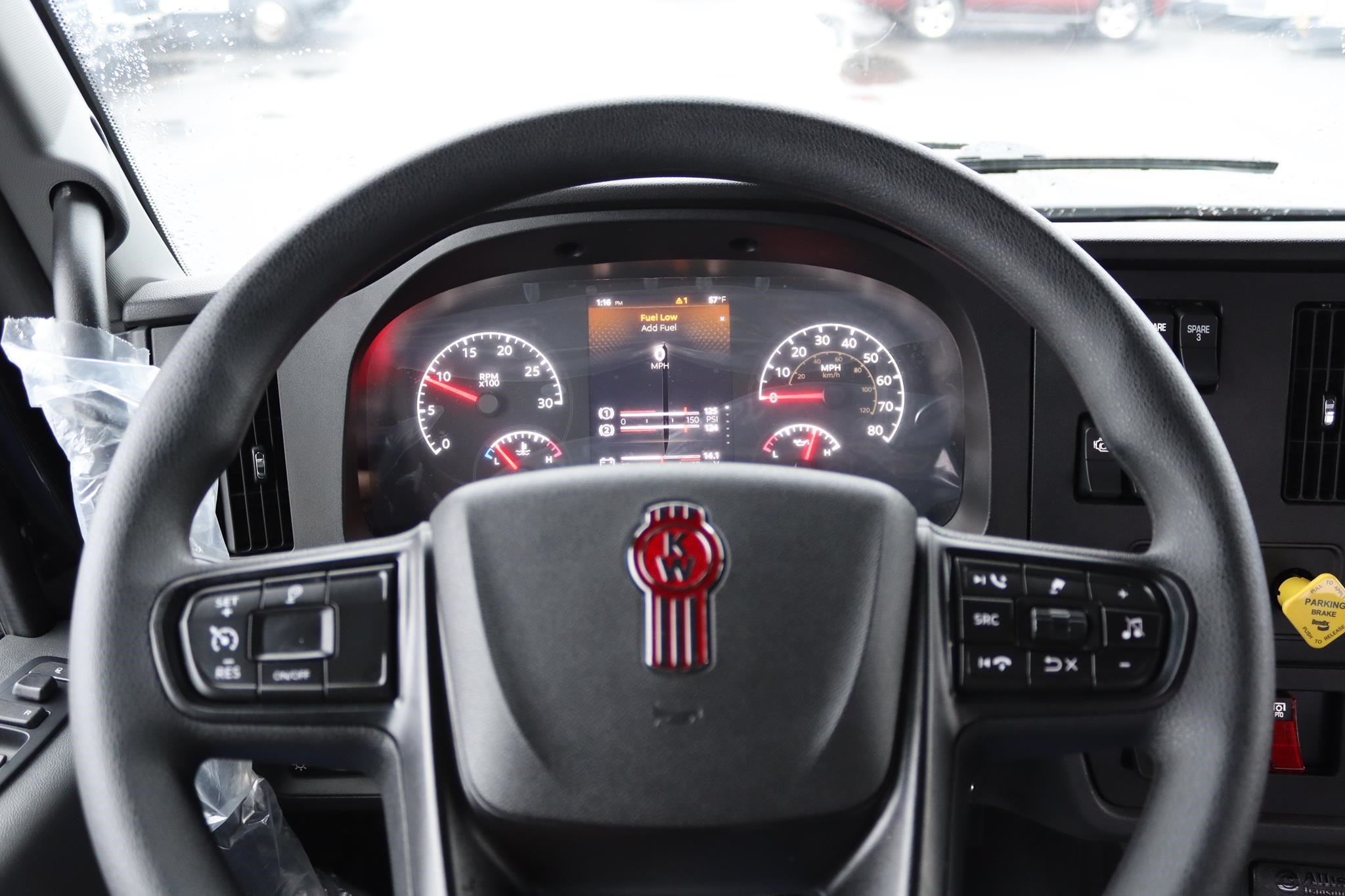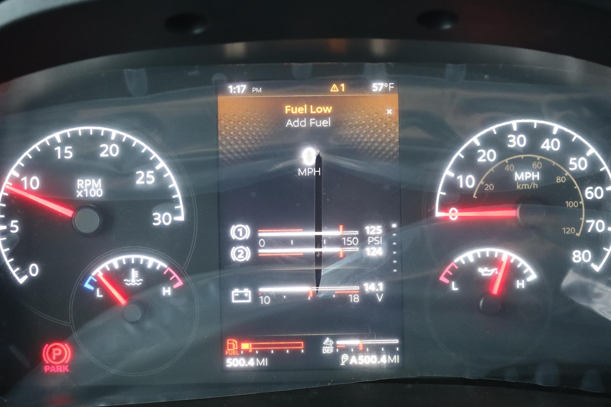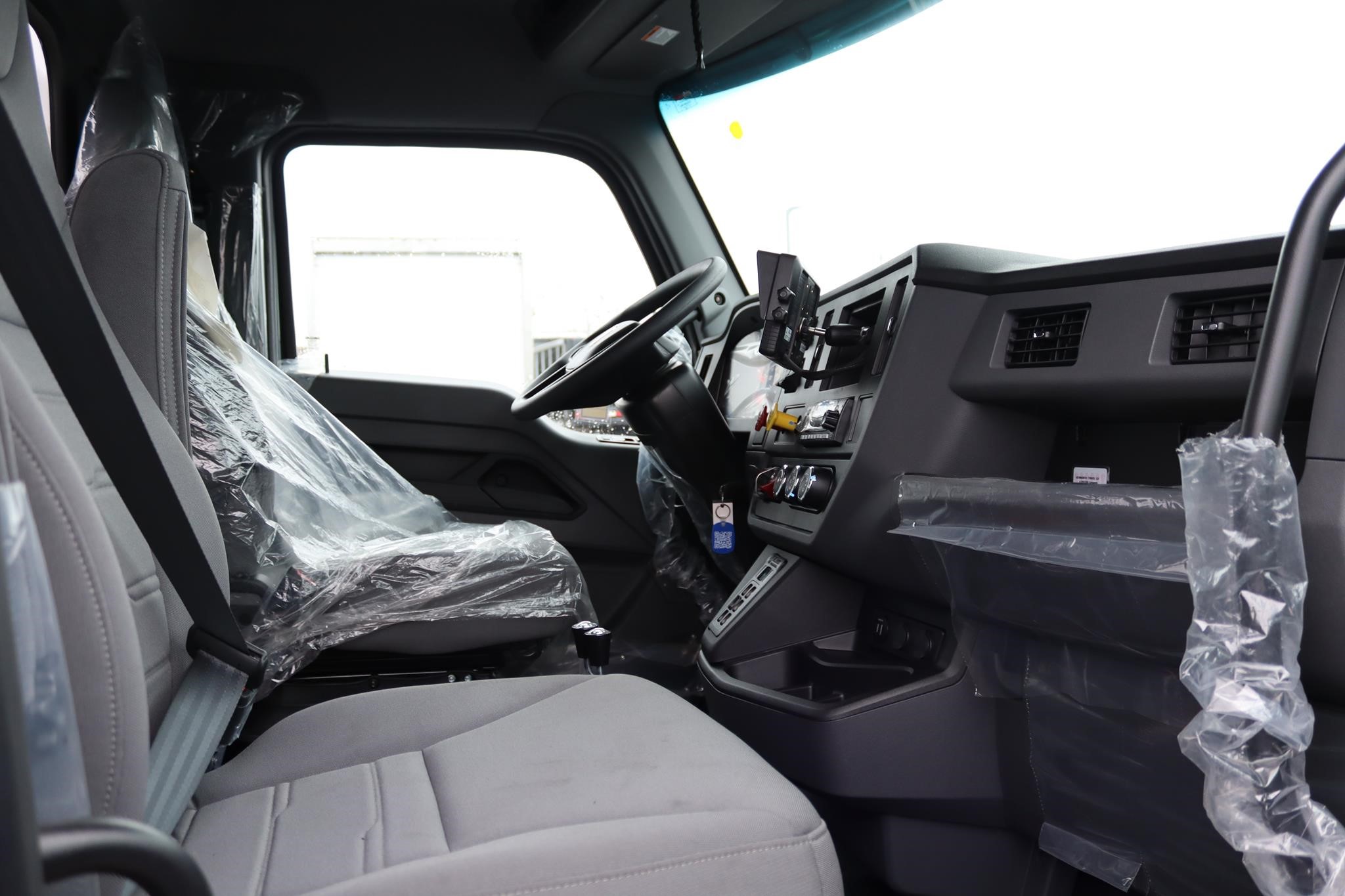 The interior features two bucket seats, an air-ride driver’s seat, cruise control, A/C, AM/FM/BT radio, heated mirrors, power locks, power windows, tilt-tele, strobes, backup camera, air brakes, and exhaust brake.
