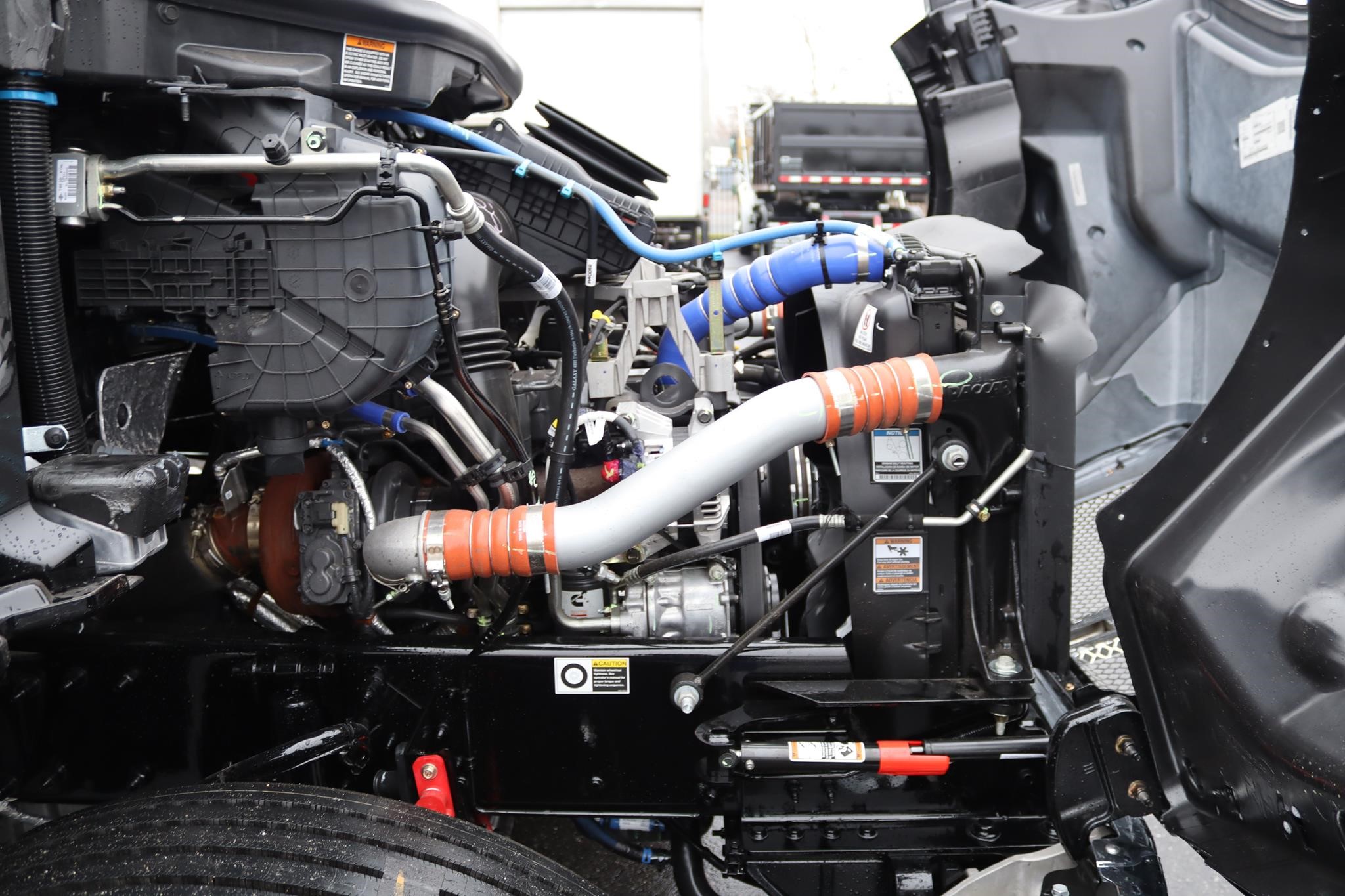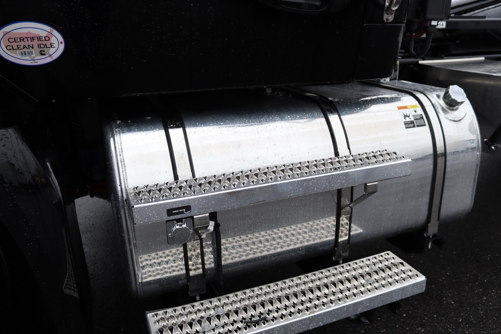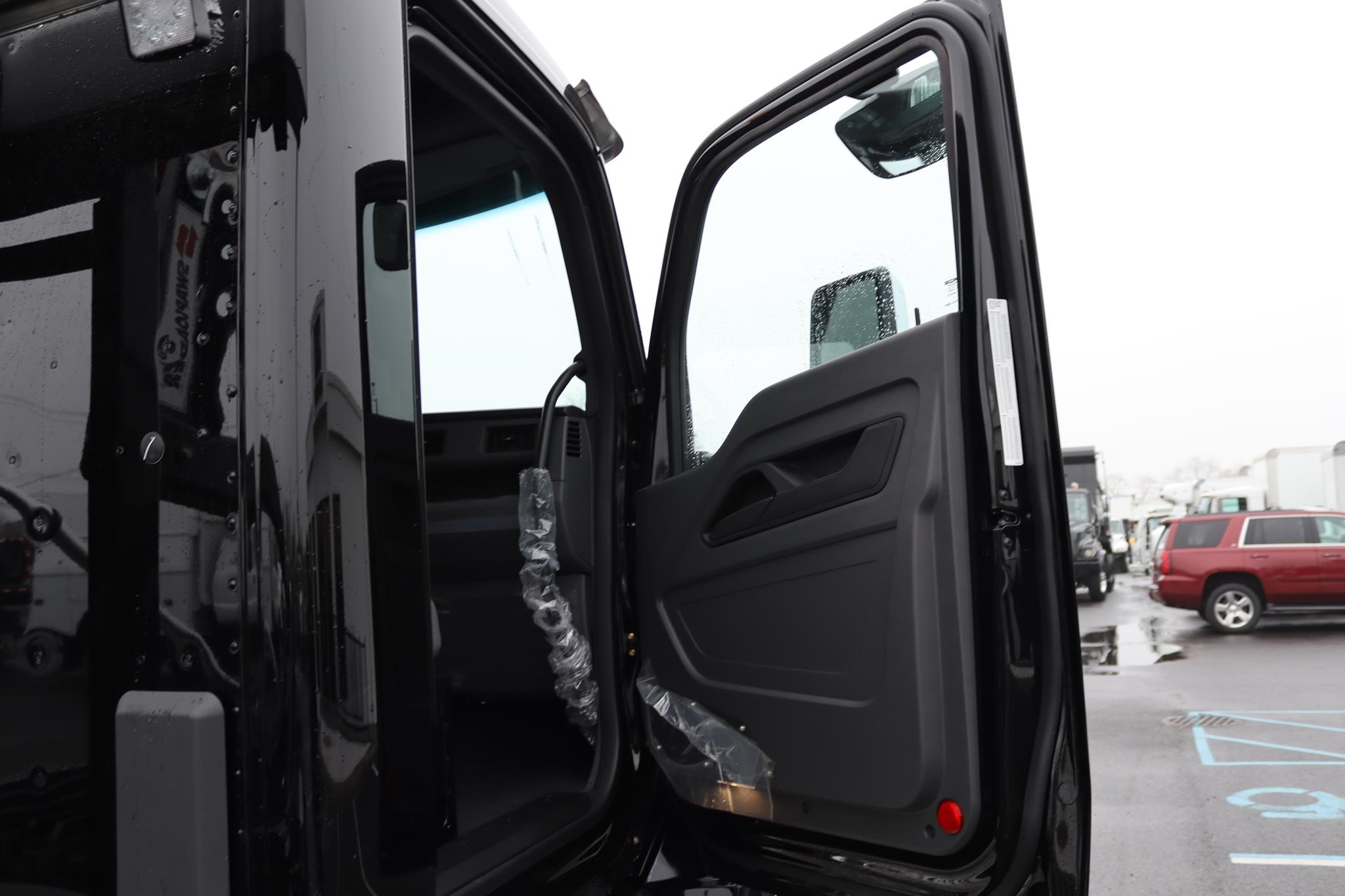 The interior features two bucket seats, an air-ride driver’s seat, cruise control, A/C, AM/FM/BT radio, heated mirrors, power locks, power windows, tilt-tele, strobes, backup camera, air brakes, and exhaust brake.