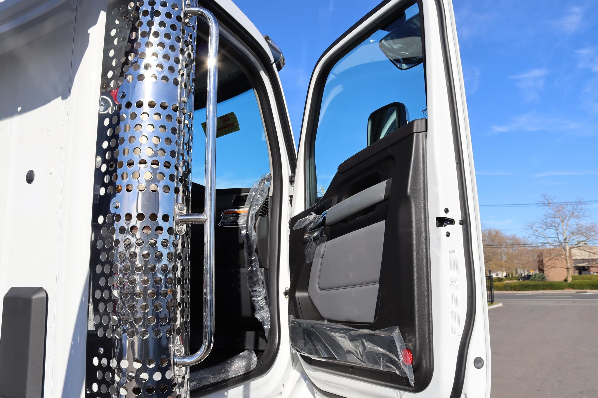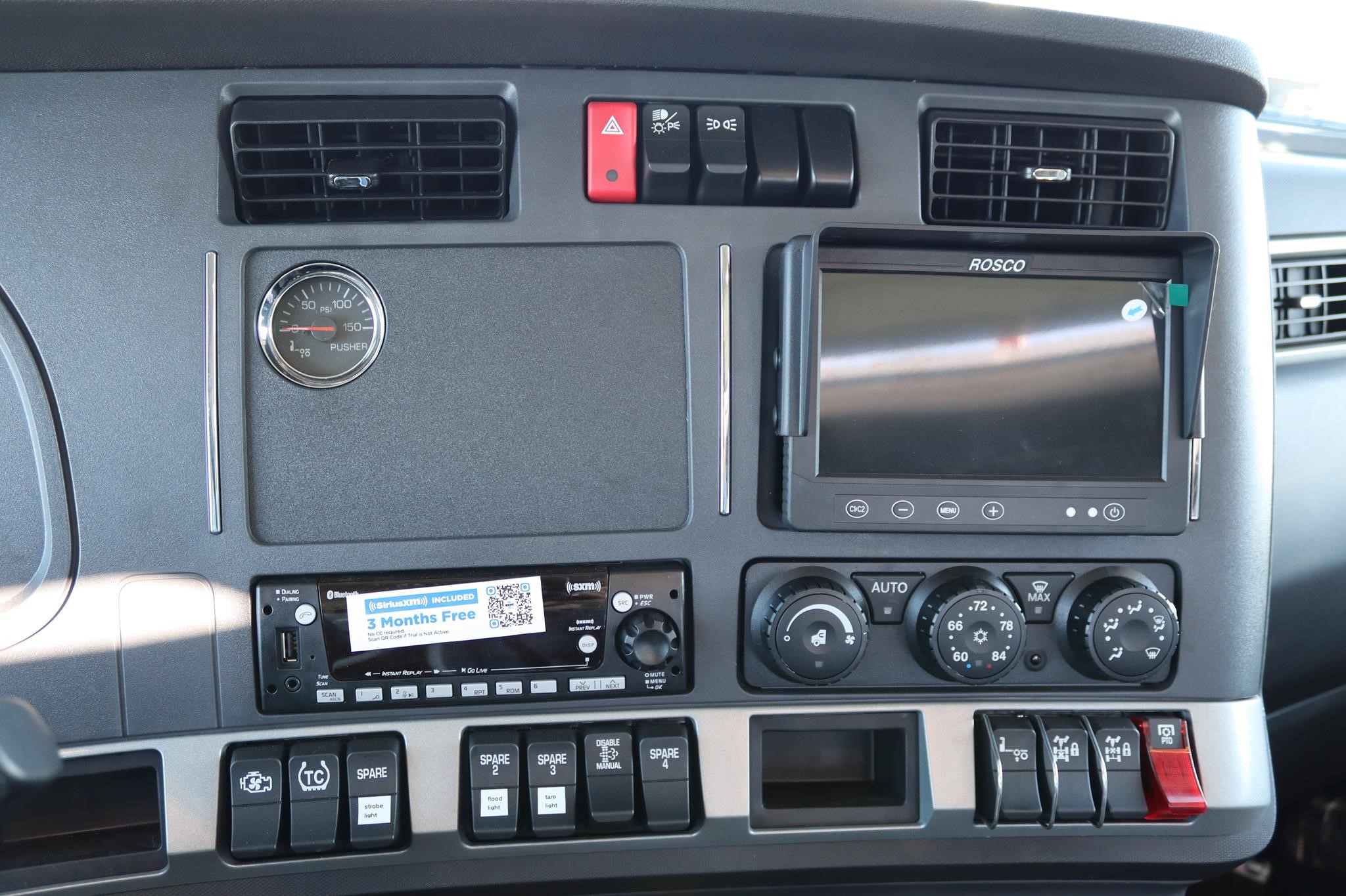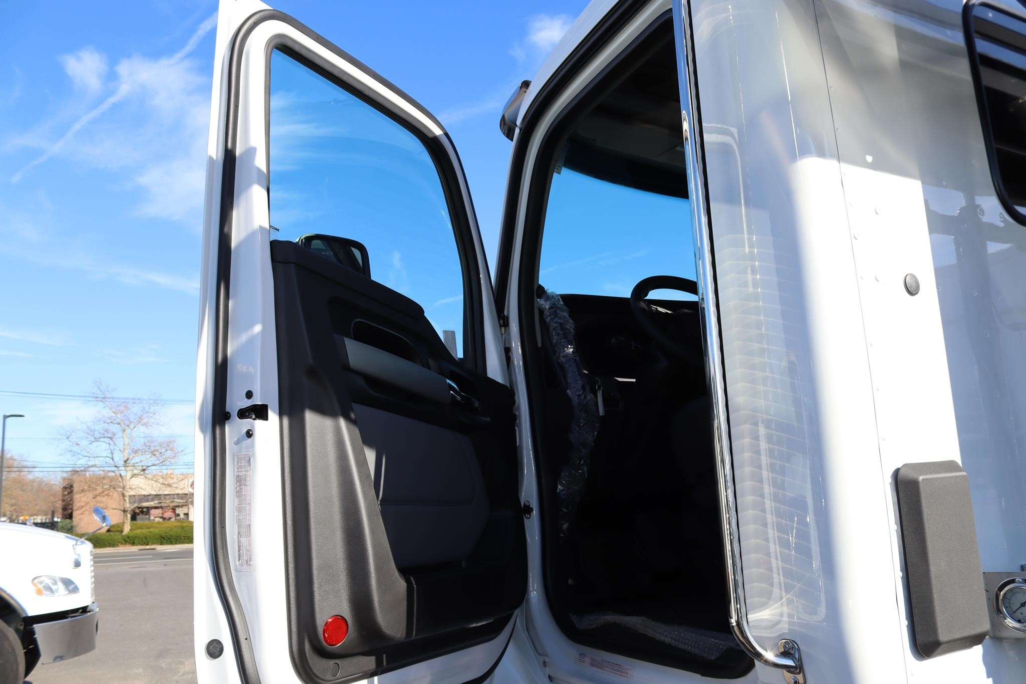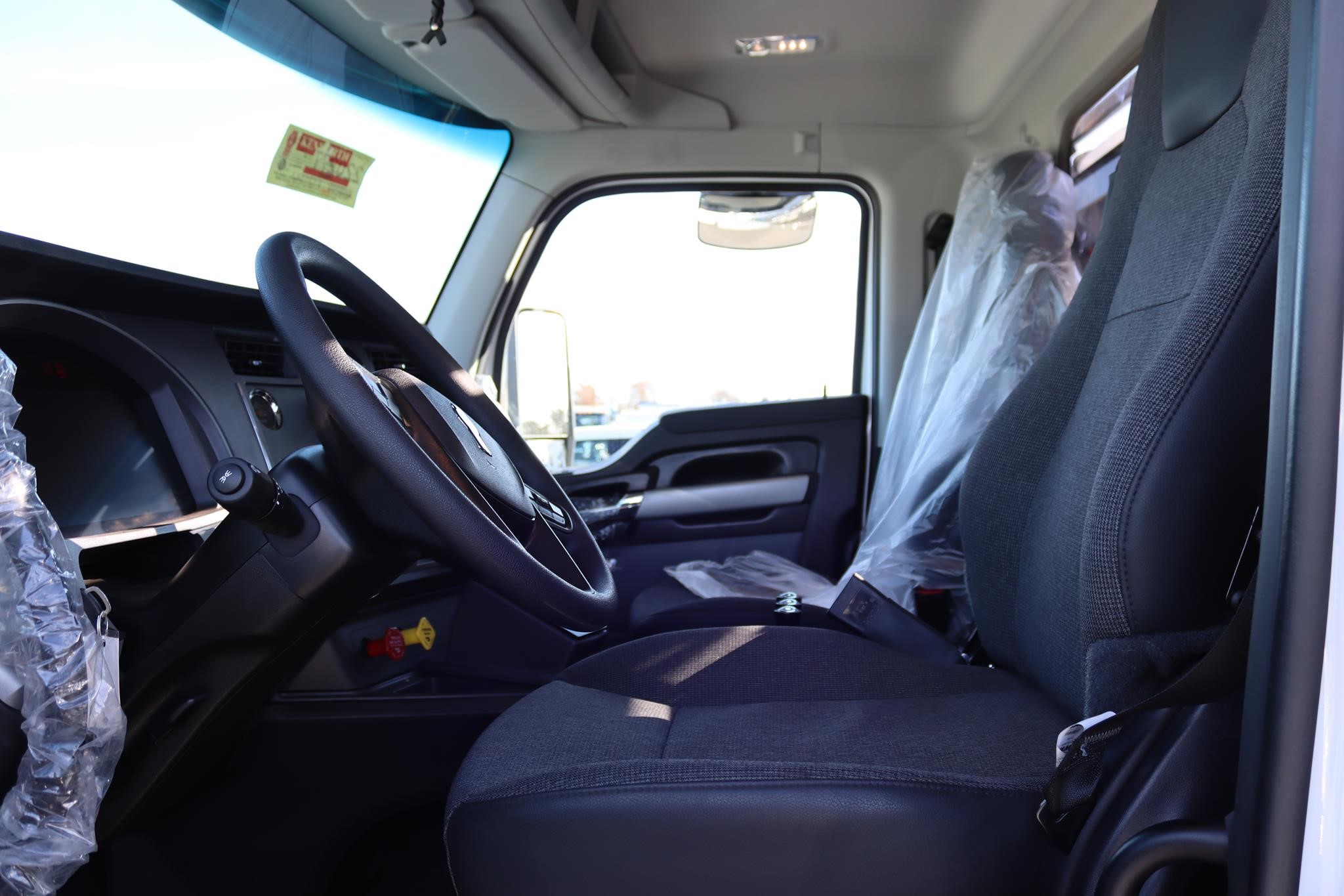The interior features an air ride driver seat, two bucket seats, cruise control, A/C, AM/FM/BT radio, power locks, power windows, heated mirrors, tilt-tele, strobes (4x), flood lights, traction control, air brakes, engine brake, and differential locks.
